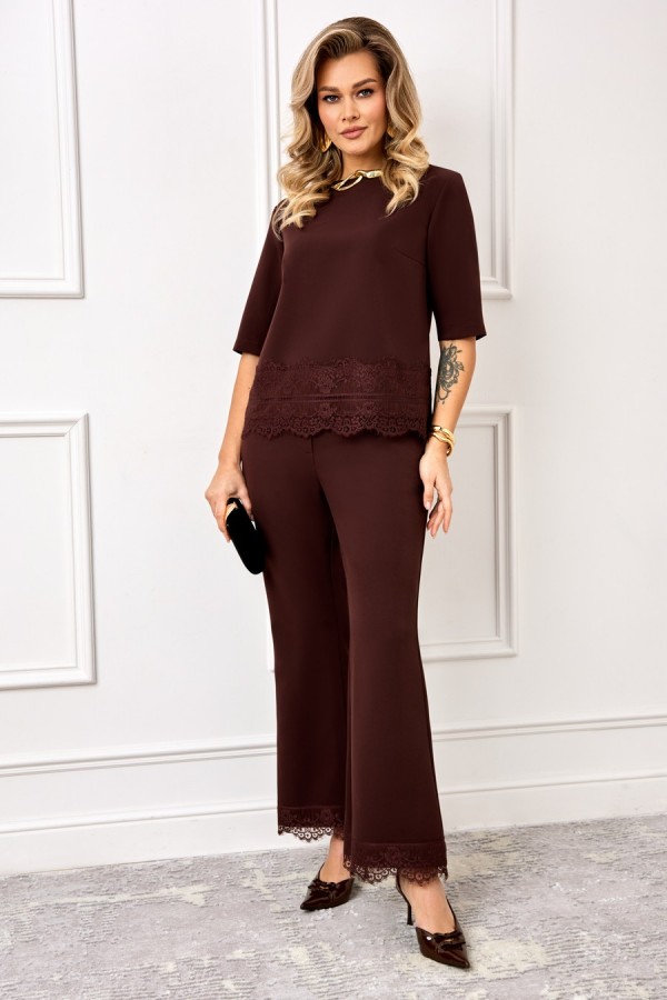 Стильный и невероятно удобный комплект, состоит из блузы и брюк. Блуза прямого силуэта, выполнена из ткани Барби с добавлением вискозы. Низ блузы декорирован французским кружевом, по спинке с застежкой на молнию. Рукав втачной, слегка спущенный. Брюки на поясе, по спинке с резинкой, спереди с застежкой на молнию и пуговицу. Брюки модного в этом сезоне силуэта, слегка заужены в области колена и расклешены к низу. Низ брюк декорирован французским кружевом.