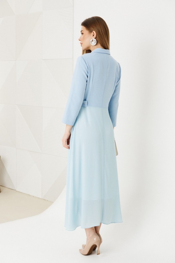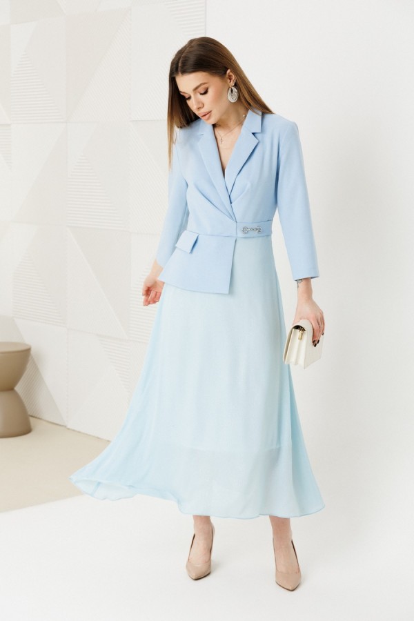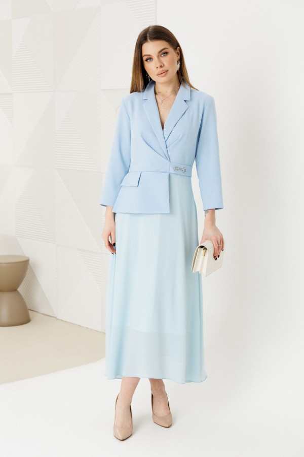 Платье женское прилегающего силуэта, расклешенное к низу. По переду платья нагрудные складки, воротник пиджачного типа, застежка с имитацией запаха,с пришивным декоративным элементом. С переди по талии отдельная фигурная баска с клапаном. Спинка со средним швом и талиевыми вытачками. Рукав одношовный 7/8.Юбка притачная на подкладке. В боковом шве платья застежка на потайную тесьму-молнию