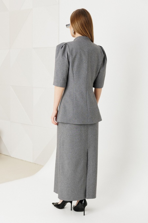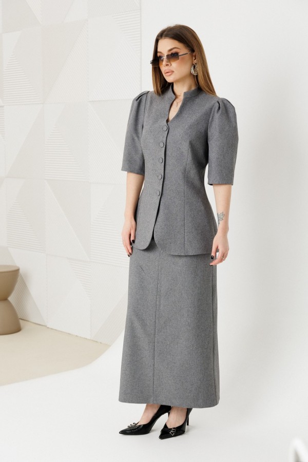 Костюм женский приталенного силуэта,выполнен из костюмной ткани.Жакет на подкладке,по переду застежка на металлические пуговицы,рукав"ФОНАРИК".Юбка миди расклешенная к низу на притачном поясе.По переду застежка на молнию и пуговицу.По бокам действующие карманы.Юбка с разрезом сзади