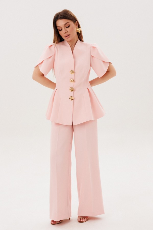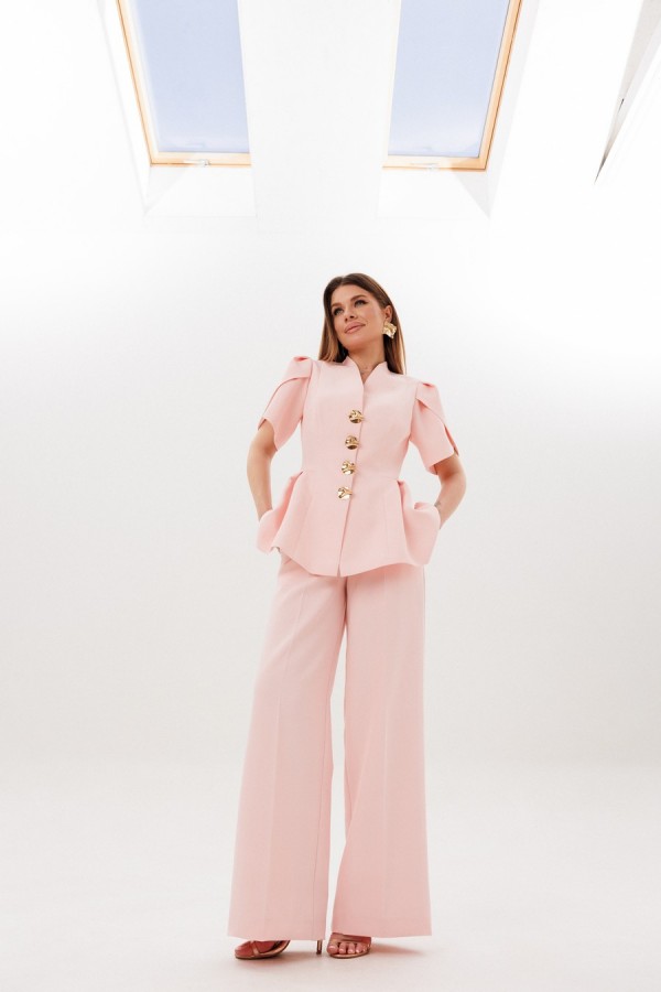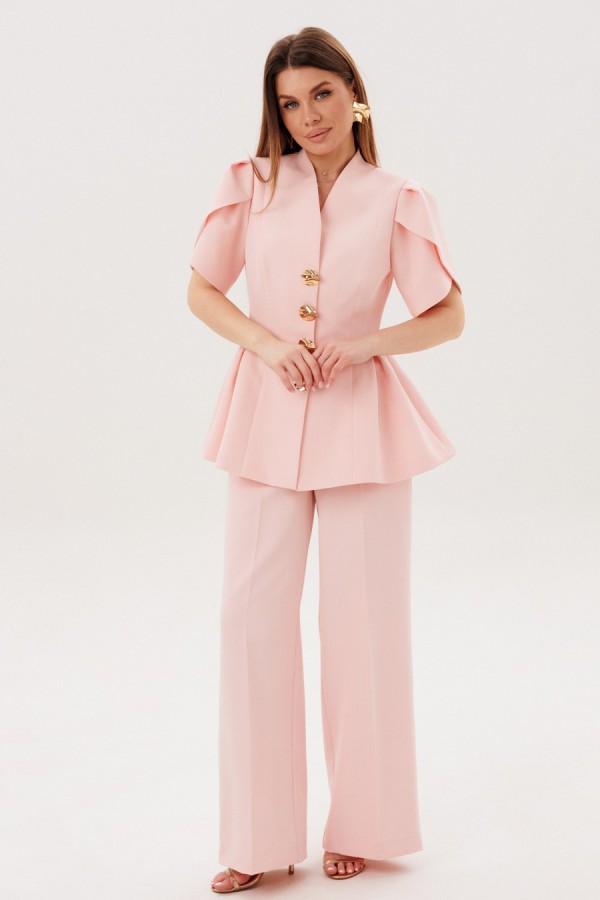 Костюм женский приталенного силуэта,выполнен из костюмной ткани.Жакет на подкладке,по переду застежка на металлические пуговицы,рукав"ФОНАРИК".По низу жакета баска..Брюки прямого кроя ,по переду на брючинах стрелки. Модель с высокой посадкой на притачном поясе обеспечивает идеальное прилегание. Спереди расположена практичная застежка на тесьму-молнию, добавляющая удобства при носке. Брюки укомплектованы функциональными боковыми карманами