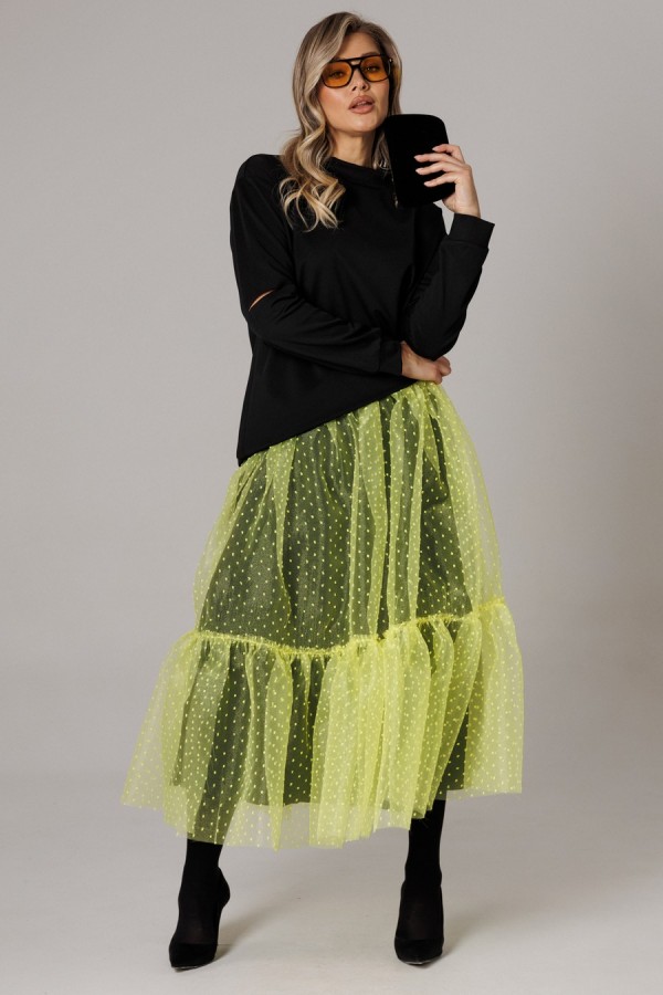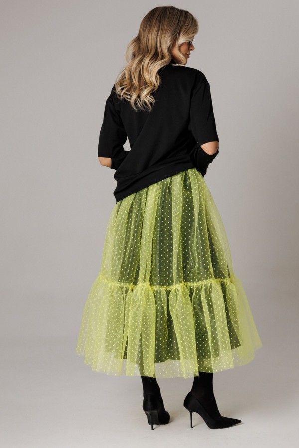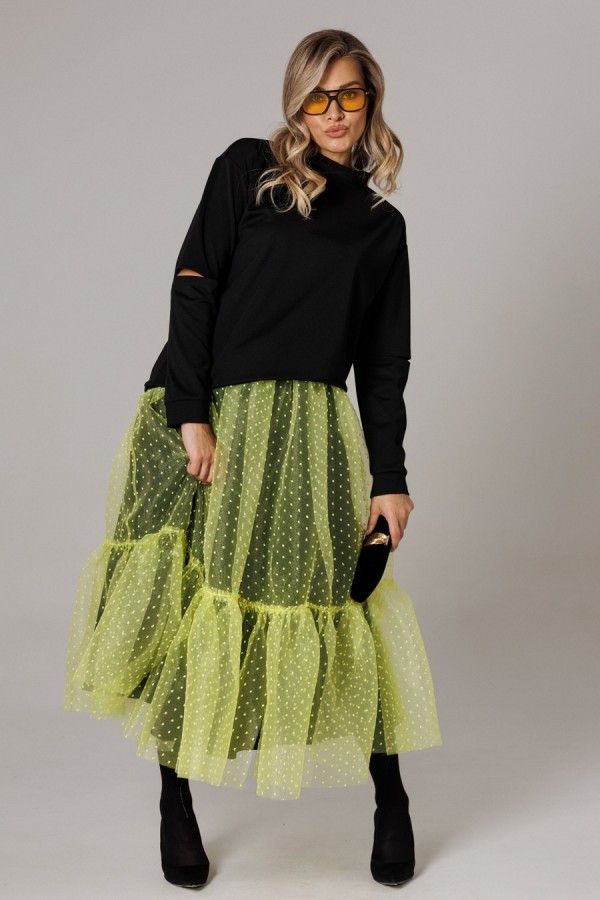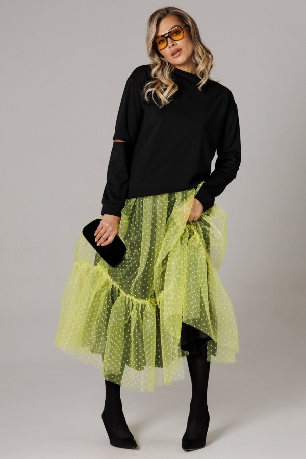 Оригинальный женский комплект от бренда Anastasia, идеальный для любого случая. Этот костюм сочетает в себе элегантность и комфорт, что делает его подходящим как для повседневной носки, так и для праздничных мероприятий. Джемпер оверсайз из трикотажного полотна. Прямого силуэта со спущенным плечом. Воротник-стойка. По рукаву идет подрез с разрезом. Низ рукава и низ джемпера - на манжете. Джемпер лекго сочетается с любыми низами: брюки, джинсы, юбка. Юбка макси из 2-х видов ткани: верх с отрезным валаном из органзы, подкладка юбка солце из шифона. Пояс на декоративной резинке. Фасон универсален, а использование резинки на поясе повышает комфортность носки, позволяя юбке адаптироваться под индивидуальные особенности фигуры. Юбку легко сочетать с различными верхами: топ, блузка, футболка, кружевной жакет, свитер или жакет из тексиля - все это позволит создавать различные образы на разные случаи. Длина по спинке 68см. Длина рукава (с манжетой): 60см. Длина юбки: 90 см