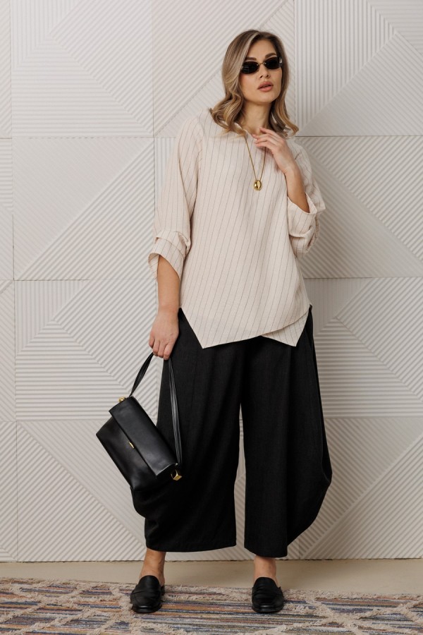 Состав:Блузка Полиэстр-45%, вискоза-44%, хлопок-8%, лен-3%, брюки полиэстер -75%, лен-15%, хлопок-10%