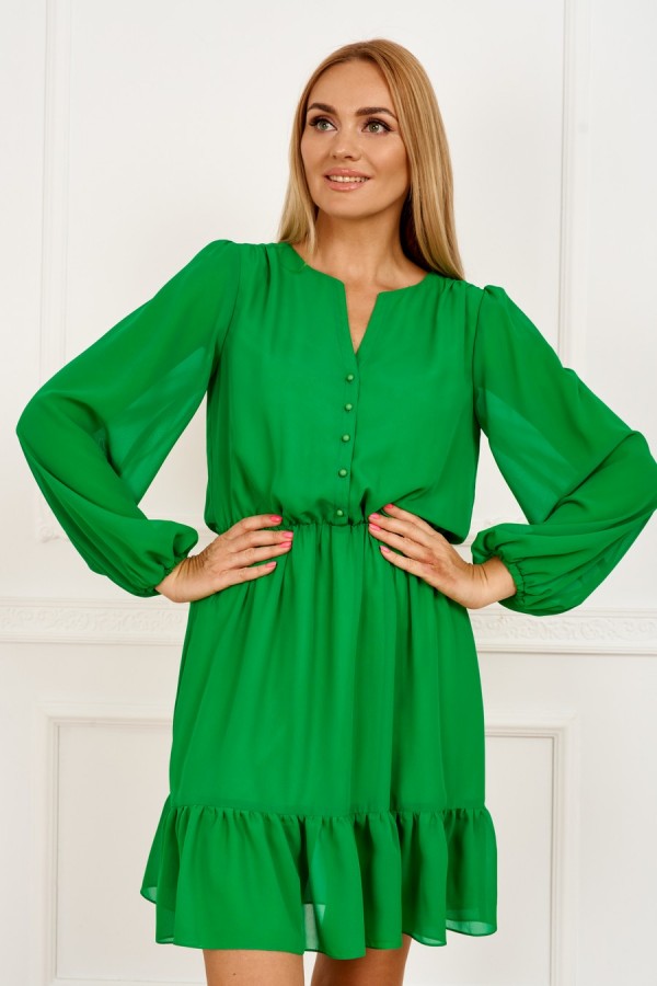 Платье женское из шифоновой ткани на чехле. Отрезное по линии талии с резинкой по поясу изделия. Рукав длинный, широкий со сборкой по окату и низу рукава, вырез горловины V -образный, застёжка спереди на планки с пуговицами. По низу изделия-волан.
