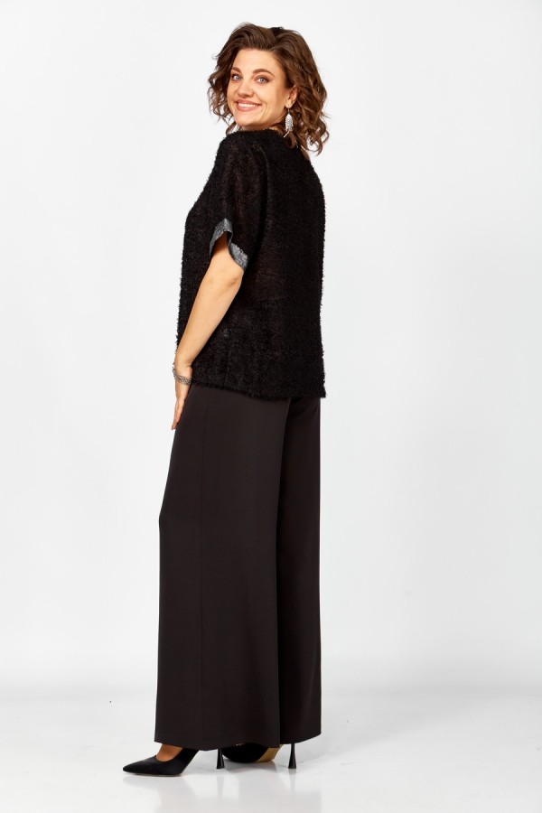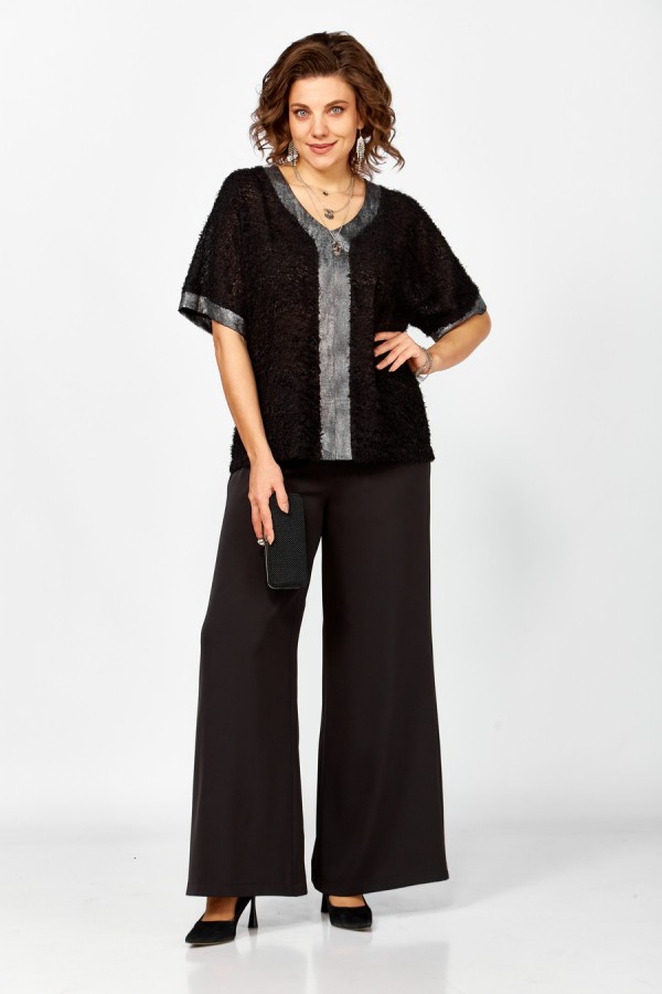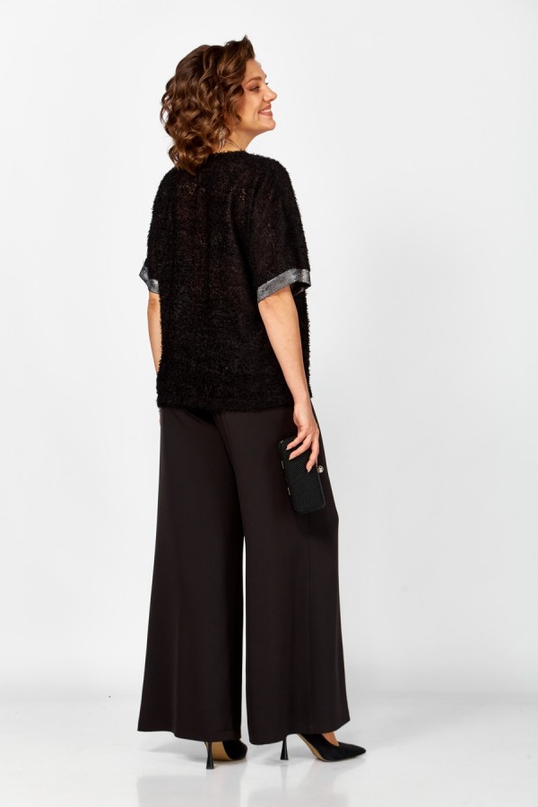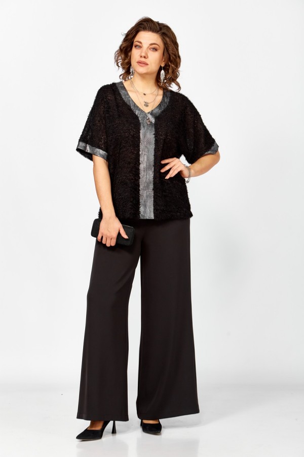 Женский нарядный двухпредметный комплект состоит из блузы,выполненной из двух видов ткани: шифона "травка" и отделочной ткани,и широких брюк палаццо из струящейся плательно-костюмной черной ткани. Блуза свободная, силуэта "летучая мышь" со спущенными плечами. По переду отрезные вертикальные вставки переходящие в V-образный вырез горловины. Спинка цельная. Вставки переда и манжеты выполнены из отделочной ткани. Брюки широкие на притачном поясе с резинкой по кругу .