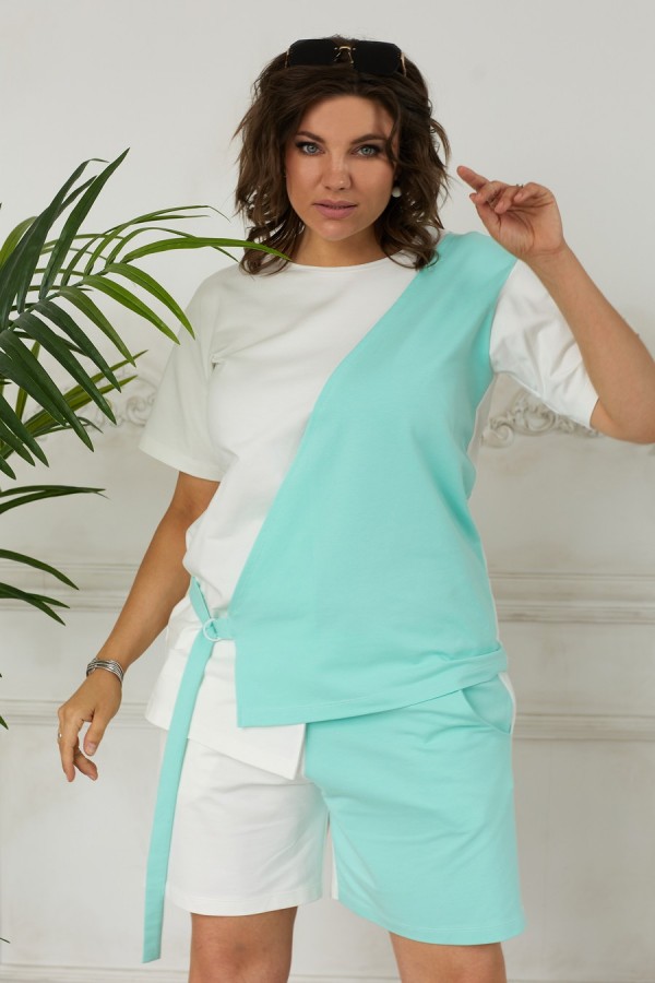 Комплект женский полуприлегающего силуэта, состоящий из блузы и шорт. Если вы хотите летом чувствовать себя легко и свободно, тогда это именно то, что вам нужно. Потрясающе удобный, мягкий и трендовый костюмчик, который должен быть в гардеробе любой модницы! Блуза необычного кроя с разрезными деталями на запах, контрастного цвета по переду. Притачной поясок застёгивается с помощью декоративных полуколец. Горловина блузы полукруглой формы, обработана притачной обтачкой с открытым срезом. Рукав имеет слегка спущенную линию проймы. Низ обработан вподгибку и имеет необычную ассиметричную форму. Шорты свободного прилегания, дополнены карманами «Хулиганами». Передние части шорт выполнены из конрастных цветов, которые гармонично сочетаются с верхом изделия. Верх шорт обработан широким поясом с эластичной резинкой. Блуза: длина по центру спинки: 68 см длина рукава от горловины: 36 см Обхват груди: 106см/48р; 110см/50р; 114см/52р; 118см/54р; 122см/56р; 126см/58р; 130см/60р; 134см/62р. Шорты: длина с поясом: 46 см обхват бёдер: 112см/48р; 116см/50р; 120см/52р; 124см/54р; 128см/56р; 132см/58р; 136см/60р; 140см/62р. Рост фотомодели 174 см, размер одежды на фото 52.