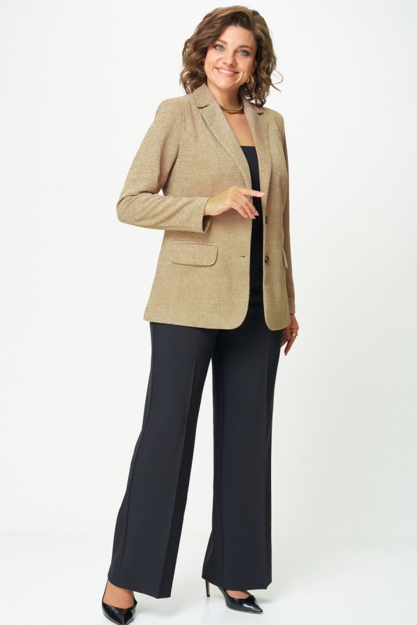 Жакет женский удлиненный, из трикотажной ткани, перед жакета на подкладке, полуприлегающего силуэта с центральной бортовой застежкой на пуговицы до линии перегиба лацкана. Спереди рельефные швы от плечевого шва, отрезной бочок и карман с клапаном. Спинка с рельефами от плечевого шва. Рукав втачной, двухшовный. Воротник пиджачного типа. Длина по спинке 70, длина рукава 61
