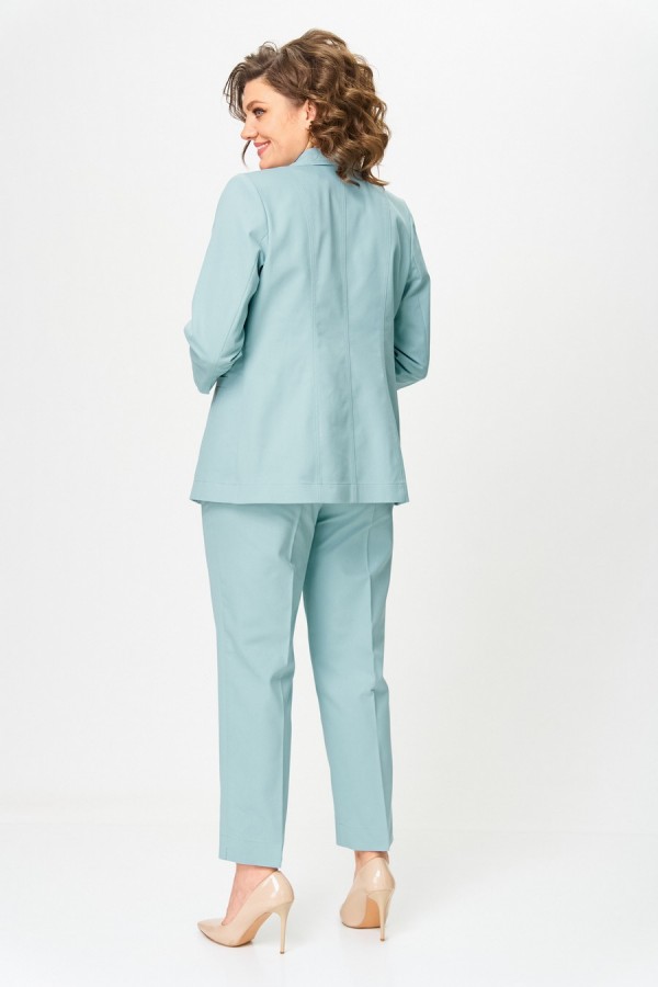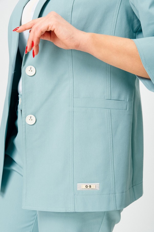 Жакет женский удлиненный, полуприлегающего силуэта с центральной бортовой застежкой на пуговицы до линии перегиба лацкана. Спереди рельефные швы от плечевого шва, отрезной бочок и карман с клапаном. Спинка с рельефами от плечевого шва. Рукав втачной, двухшовный, 3/4, с небольшим разрезом в локтевом шве. Воротник пиджачного типа. Перед жакета на подкладке. Длина рукава 50, длина по спинке 68 см.