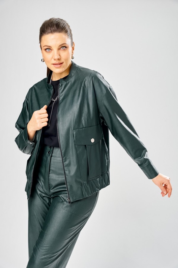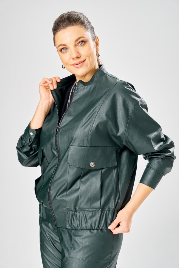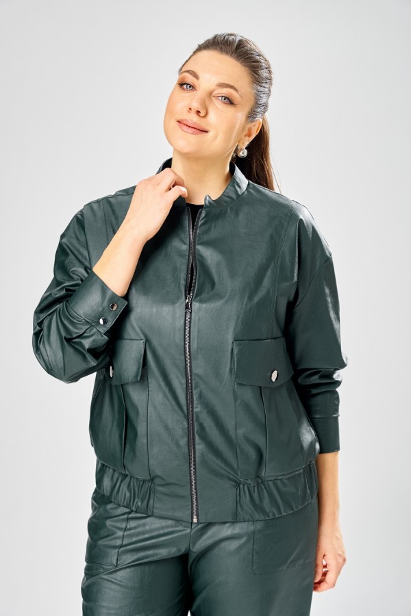 Длина куртки – 62 см Длина рукава – 50 см Стильный женская куртка свободного силуэта, из эко-кожи. Застегивается на молнию, по переду накладные карманы с клапаном и декоративной кнопкой. Головина оформлена воротником стойка. По спинке отрезная кокетка с клапаном. Рукава со спущенной поймой, по низу притачной манжет с застежкой на кнопки. По низу куртки, притачная планка с резинкой. Куртка на подкладке.