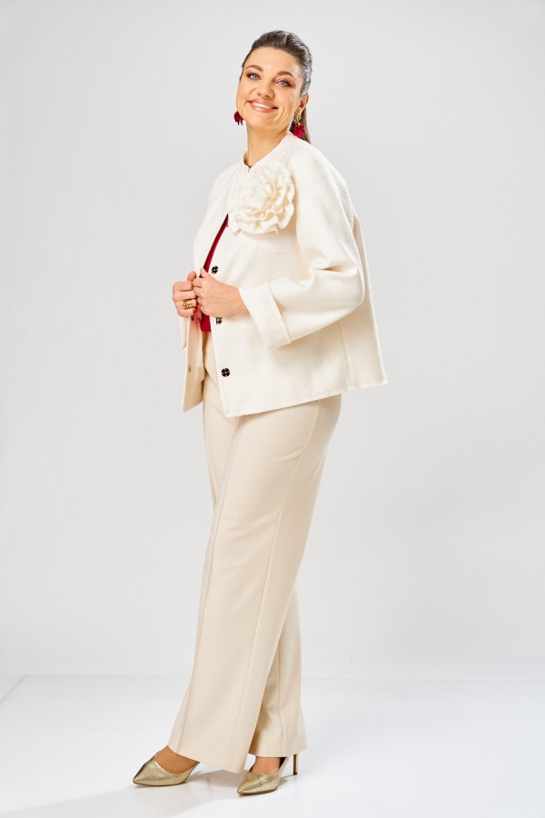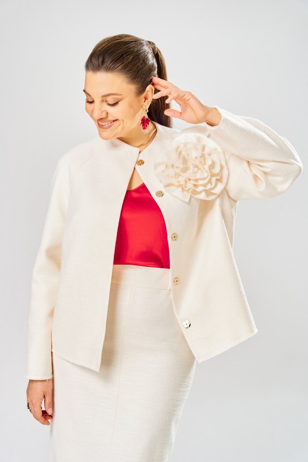 Длина жакета – 63 см Длина рукава от горловины – 77 см Стильный женский жакет, выполнен из жаккарда с большим содержанием хлопка. Жакет прямого силуэта, с центральной застежкой на пришивные кнопки Горловина с цельновыкроенной стойкой, рукав реглан. Низ рукава и низ изделия с вытрепанным краем. Жакет украшен декоративной розой из основной ткани. Жакет на подкладке.