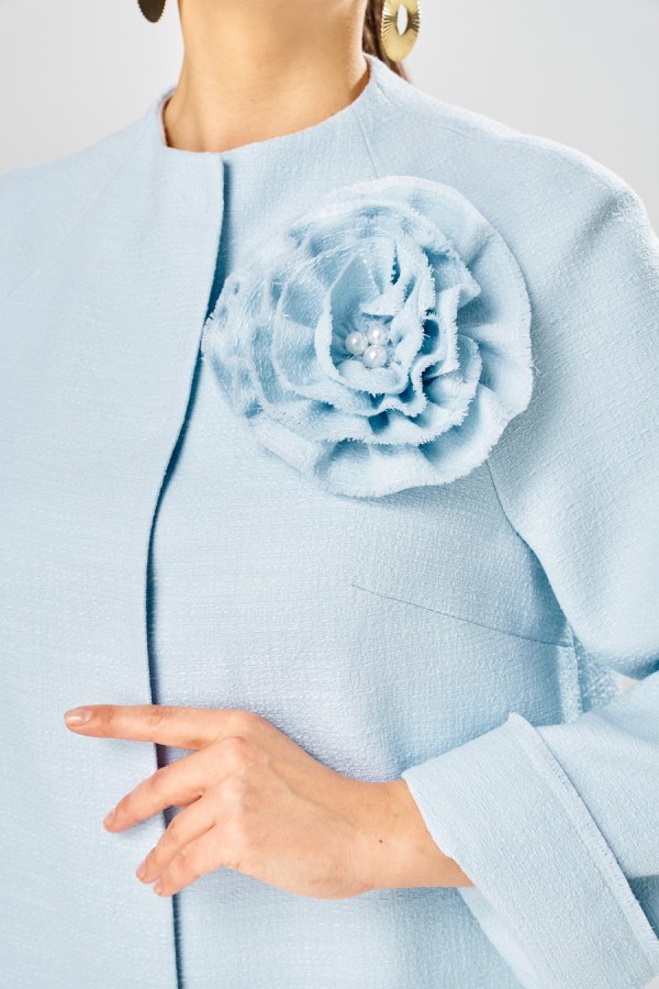 Длина жакета – 63 см Длина рукава от горловины – 77 см Стильный женский жакет, выполнен из жаккарда с большим содержанием хлопка. Жакет прямого силуэта, с центральной застежкой на пришивные кнопки Горловина с цельновыкроенной стойкой, рукав реглан. Низ рукава и низ изделия с вытрепанным краем. Жакет украшен декоративной розой из основной ткани. Жакет на подкладке.