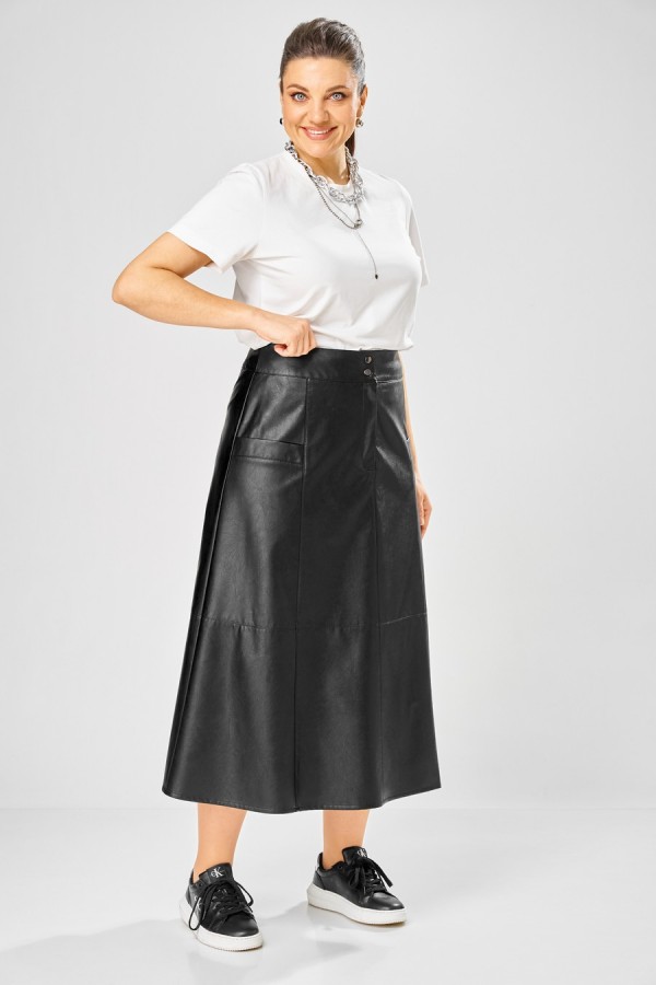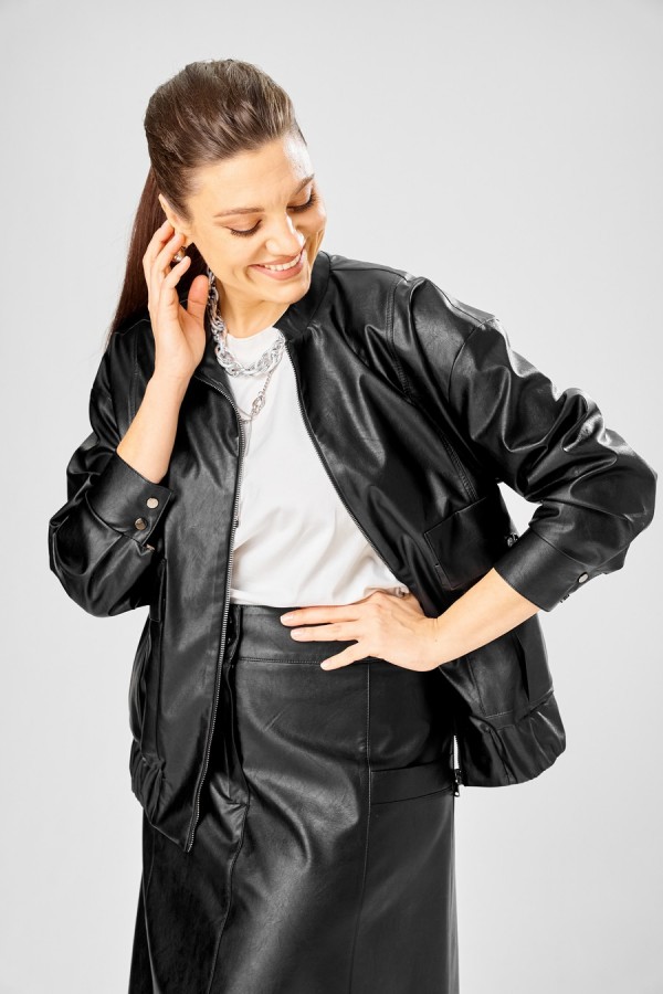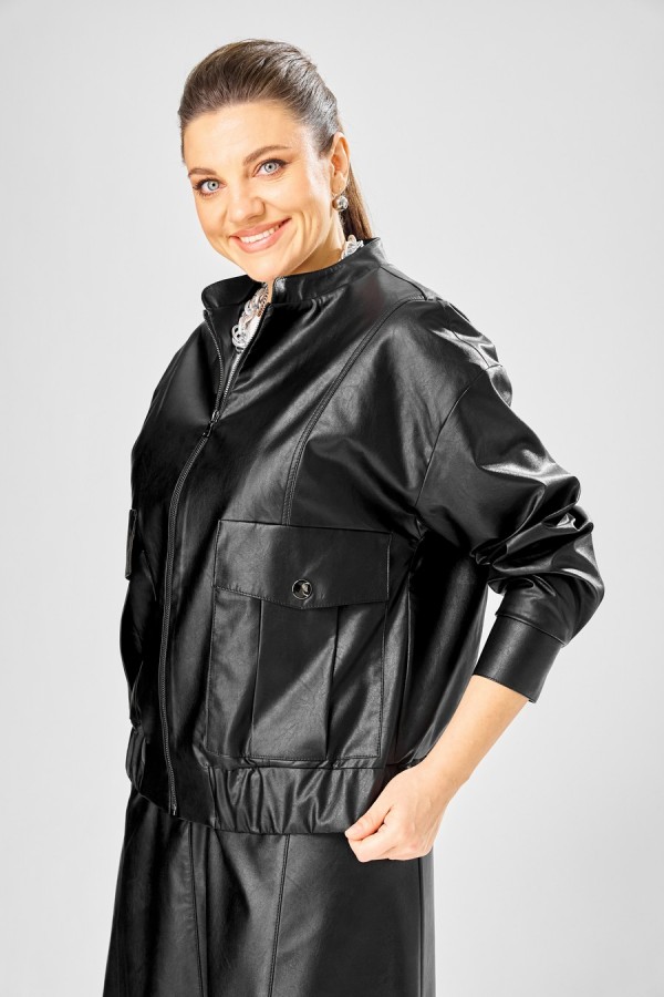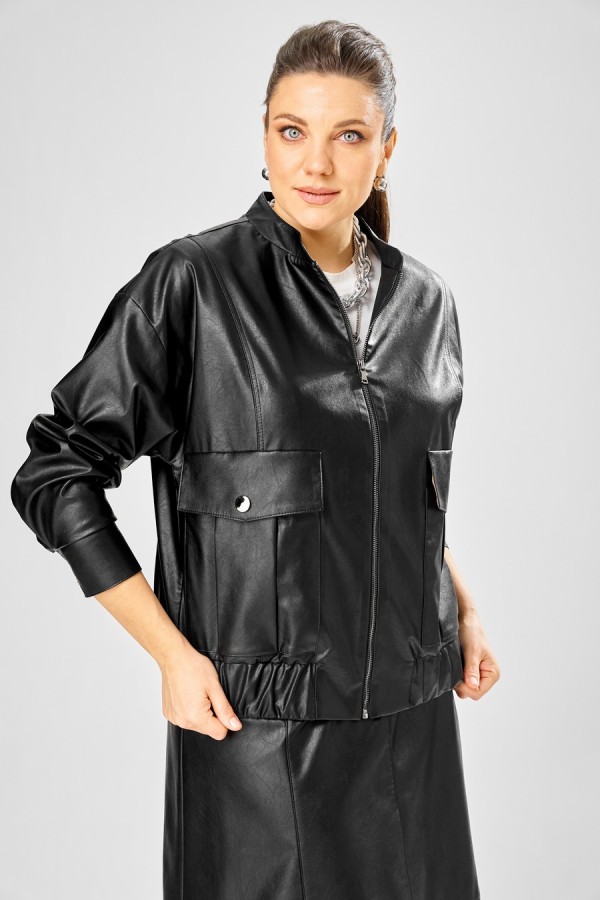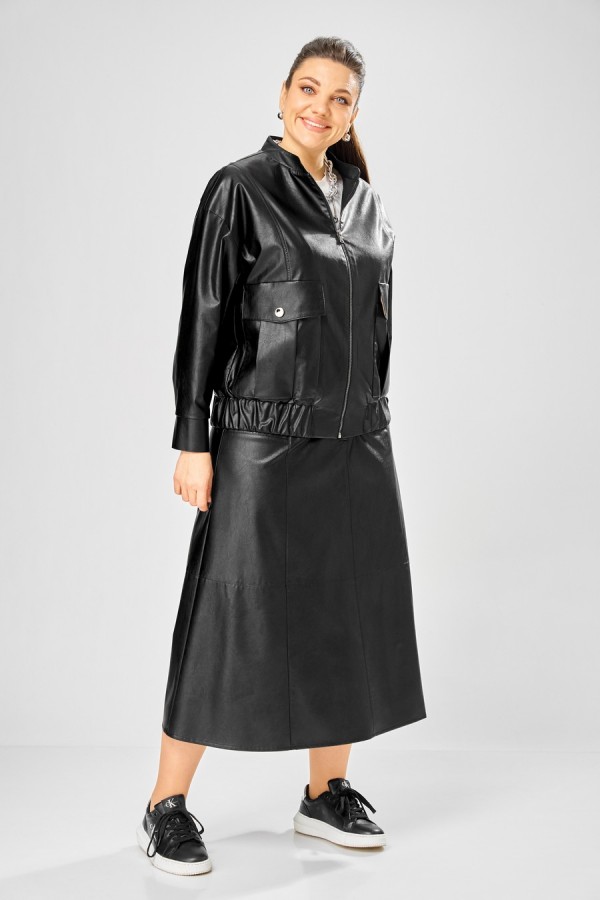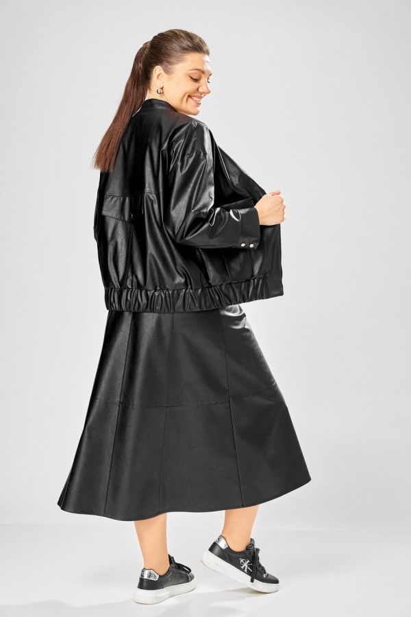 Длина куртки – 62 см Длина рукава – 50 см Длина юбки– 87 см Стильный женский комплект, выполнен из эко-кожи. Куртка свободного силуэта, застегивается на молнию, по переду накладные карманы с клапаном и декоративной кнопкой. Головина оформлена воротником стойка. По спинке отрезная кокетка с клапаном. Рукава со спущенной поймой, по низу притачной манжет с застежкой на кнопки. По низу куртки, притачная планка с резинкой. Куртка на подкладке. Юбка «А» образного силуэта, по переду и спинке рельефные швы, по переду от рельефа до бокового шва, карманы с листочкой, застежка на молнию в центральном шве переда. Верх юбки на поясе с застежкой на кнопки. Юбка на подкладке.
