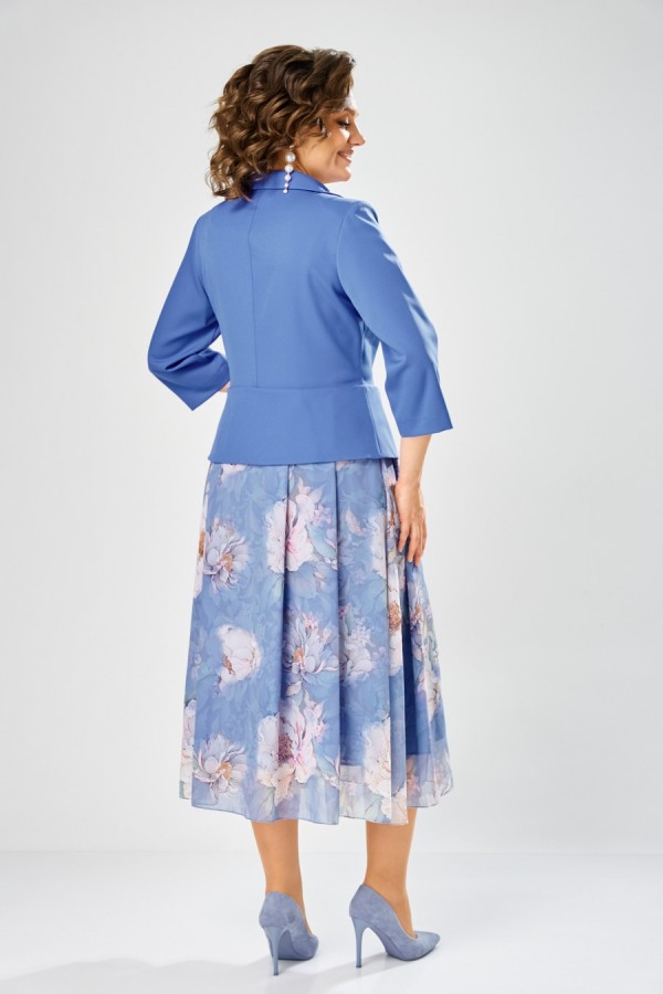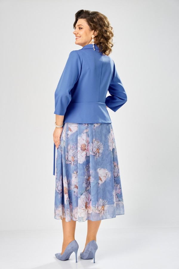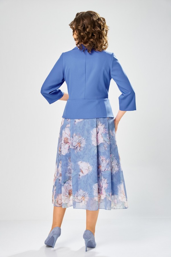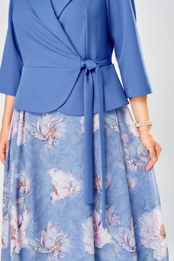 Длина платья – 124 см Длина рукава от горловины – 47.5 см Элегантное женское платье, выполнено в виде имитации костюма из двух видов ткани. Лиф из плательной ткани, юбка из шифона. Платье с запахом, горловина с воротником пиджачного типа с отложными лацканами. Рукава втачные, длина 3/4. Юбка со складками по линии талии, расширенная к низу, на подкладке. По линии талии вставлен завязывающийся пояс.
