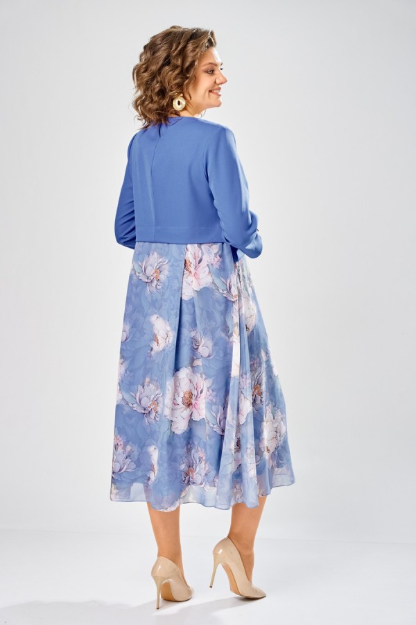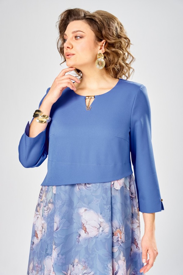 Длина платья – 113 см Длина рукава – 50 см Элегантное женское платье, выполнено из двух видов ткани. Лиф из плательной ткани, горловина круглая с декоративным элементом по центру, по низу лифа ответная складка, по переду низ асимметричный, рукава втачные, по низу декоративный элемент с пуговицей. Юбка платья из шифона, расширенная со складками, на подкладке.