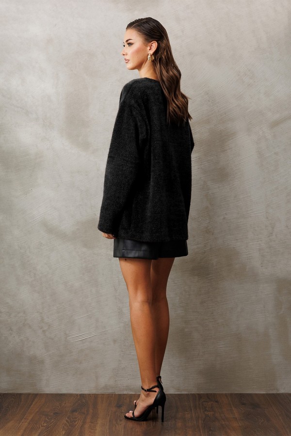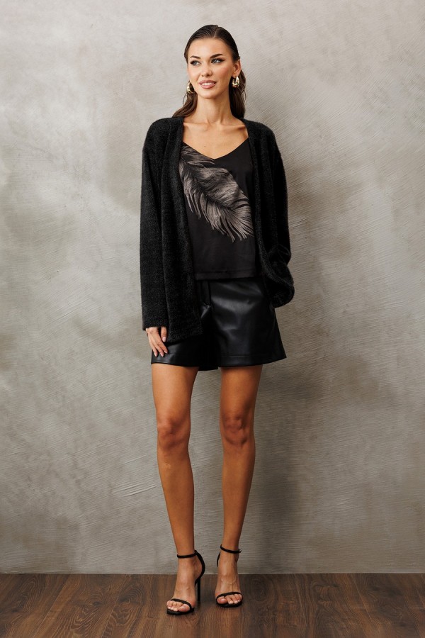 Кардиган из трикотажного полотна свободного силуэта слегка заужен к низу, со спущенной линией плеча и втачным рукавом. Полочка с V-образным вырезом и центральной застежкой на пришивные кнопки. Без подкладки.