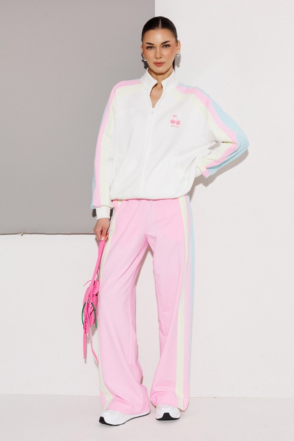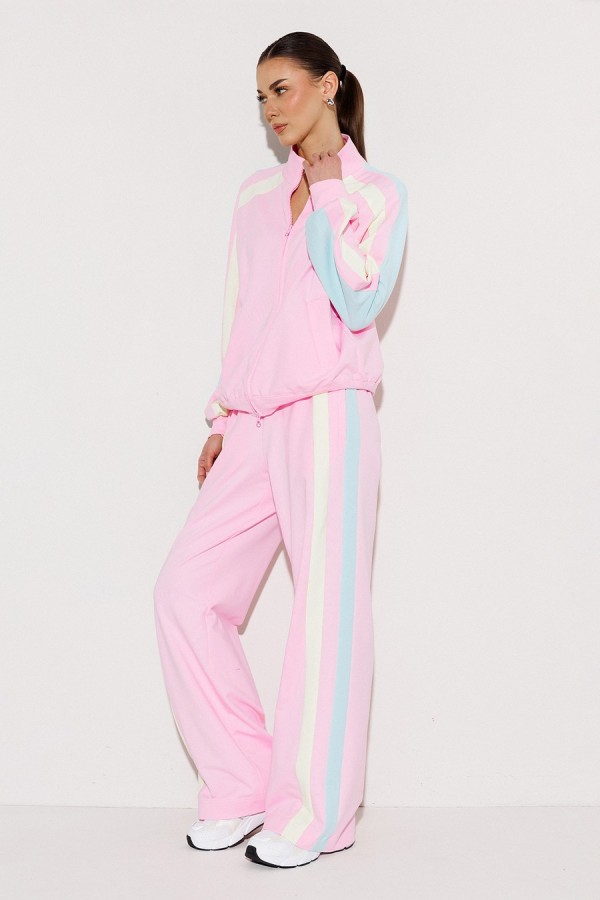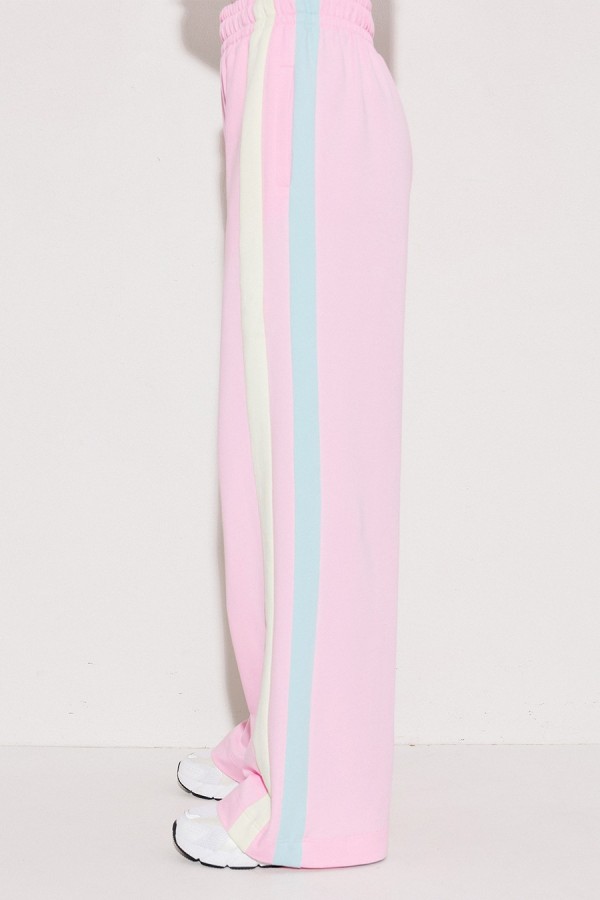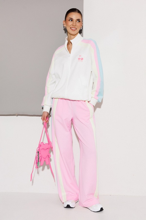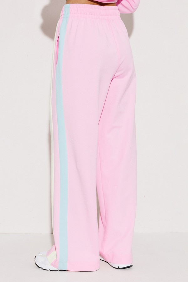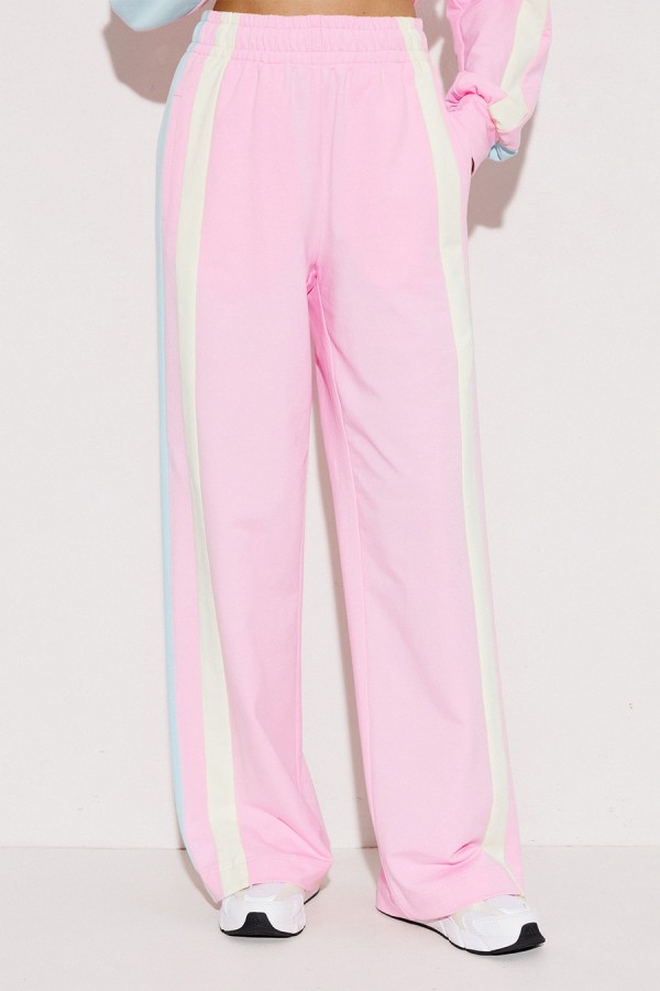 Брюки мультиколор трикотажные (2-хнитка) прямого силуэта на цельнокроеном отстроченном поясе со вставленной в него резинкой и декоративным шнурком. По бокам лампасы из ткани другого цвета и карманом-листочкой от бокового шва.