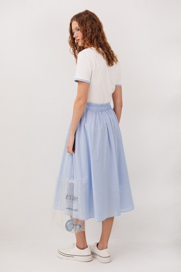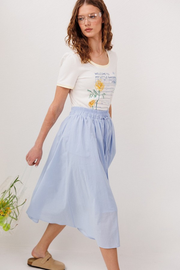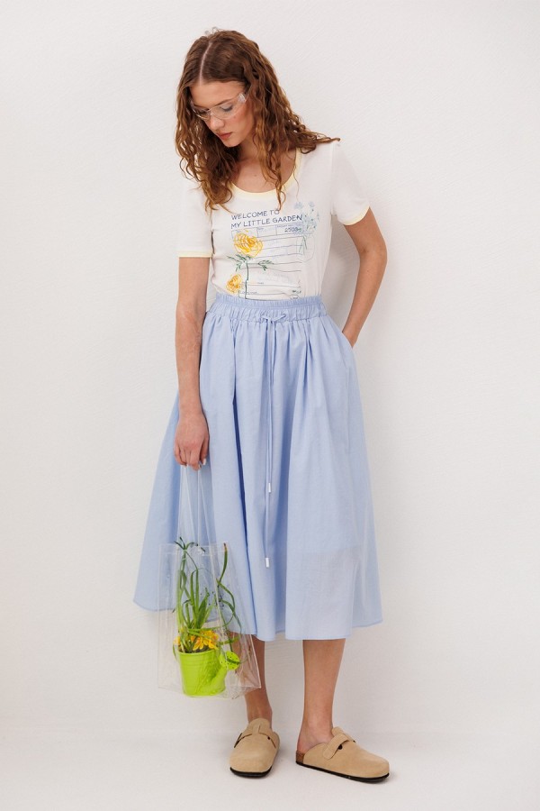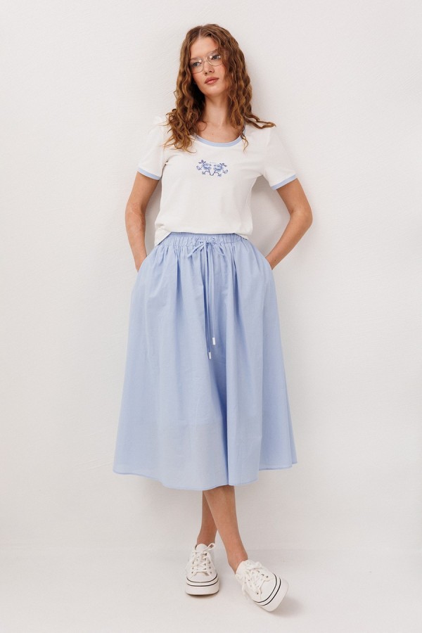 Юбка А-образного силуэта, на притачном отстроченном поясе на резинке и вставленным в него шнурком из основной ткани с наконечниками. Юбка на подкладке из основной ткани и карманами в боковом шве.