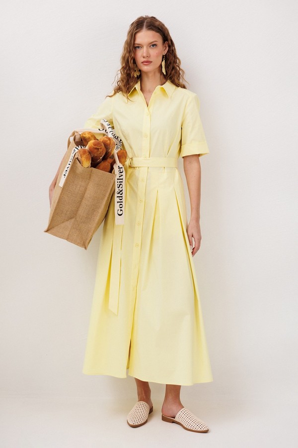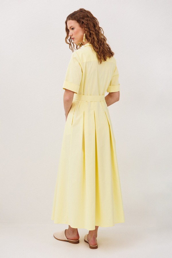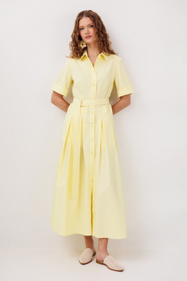 Платье длинное с втачным коротким рукавом до локтя визу на притачной манжете. Полочка с центральной застежкой на петли-пуговицы по притачной планке и с карманами в боковых швах. Платье отрезное по линии талии, лиф с талиевой вытачкой, юбка со встречными складками от талии. Спинка с кокеткой и нашивкой на кокетке. Воротник рубашечный отложной на стойке. Платье без подкладки. Съемный пояс из основной ткани на полукольцах.
