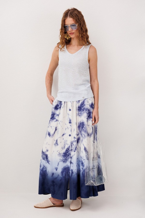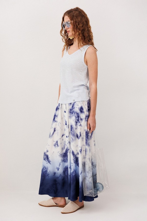 Юбка А-образного силуэта, на притачном отстроченном поясе на резинке. По переду с центральной застежкой на петли пуговицы. Юбка с карманами в боковых швах с наклонным входом, без подкладки.