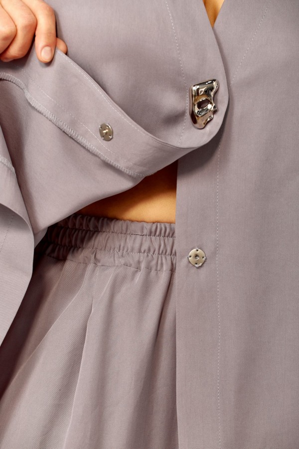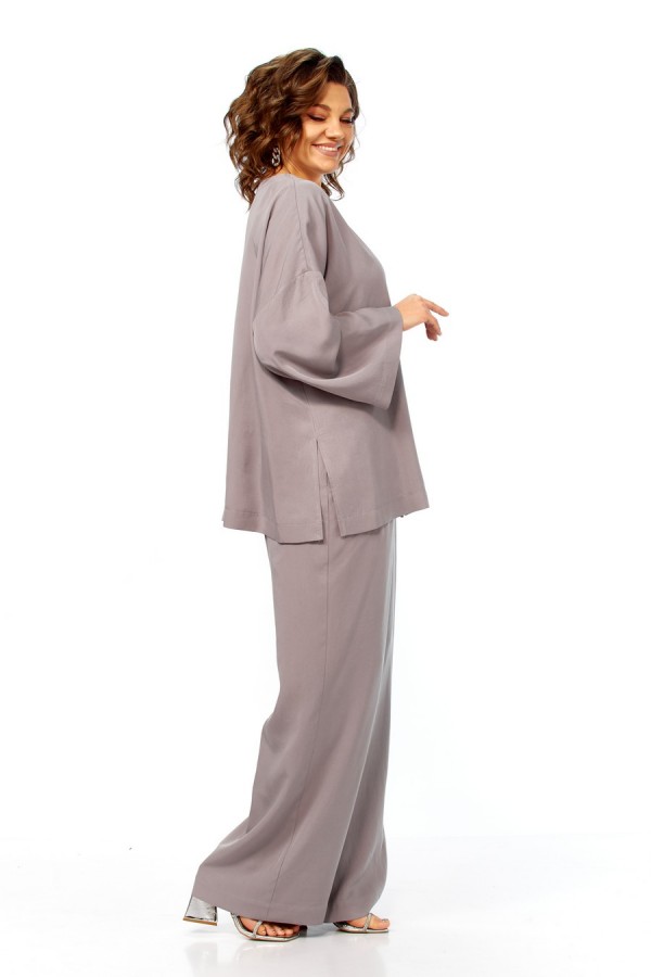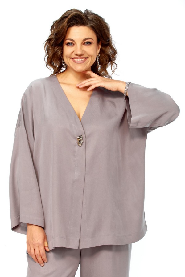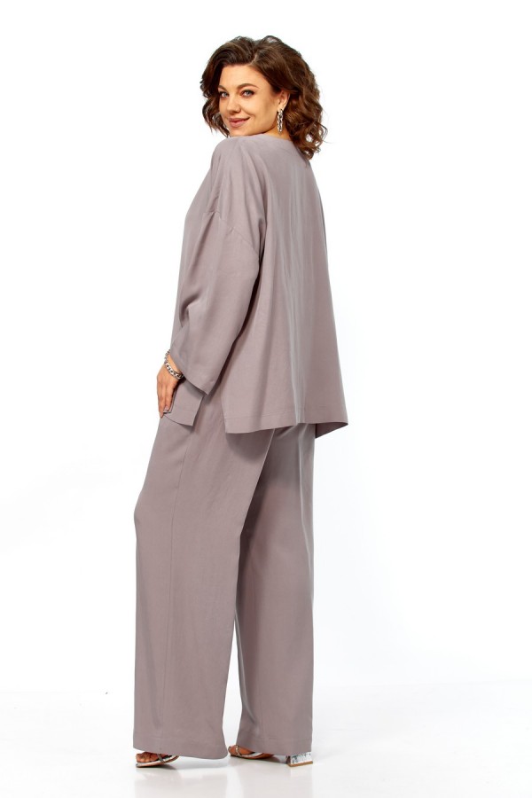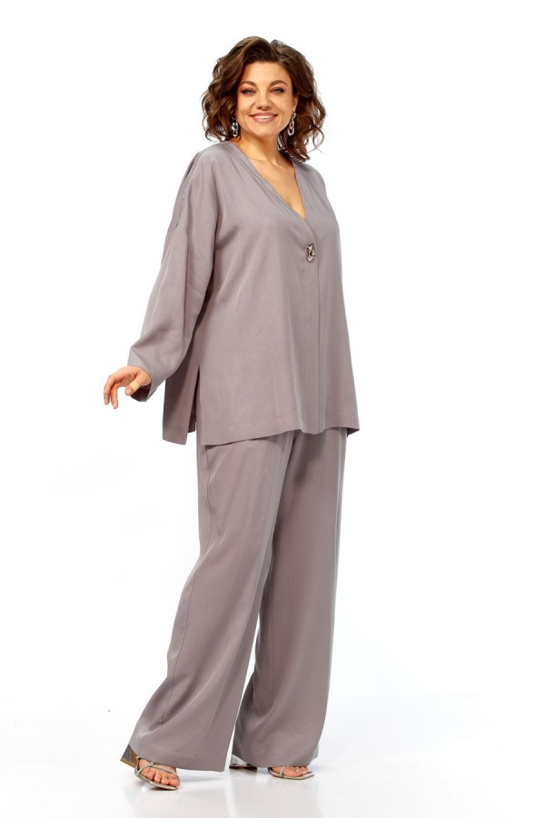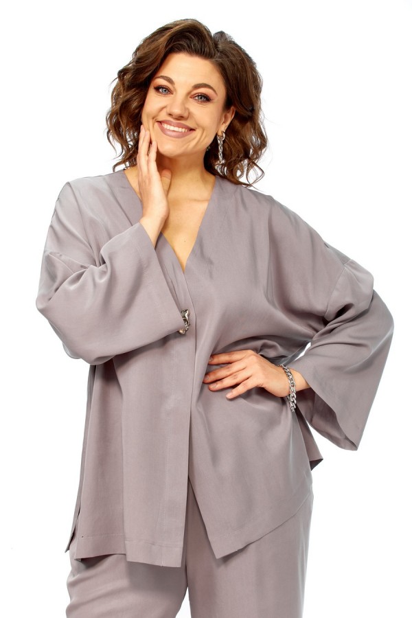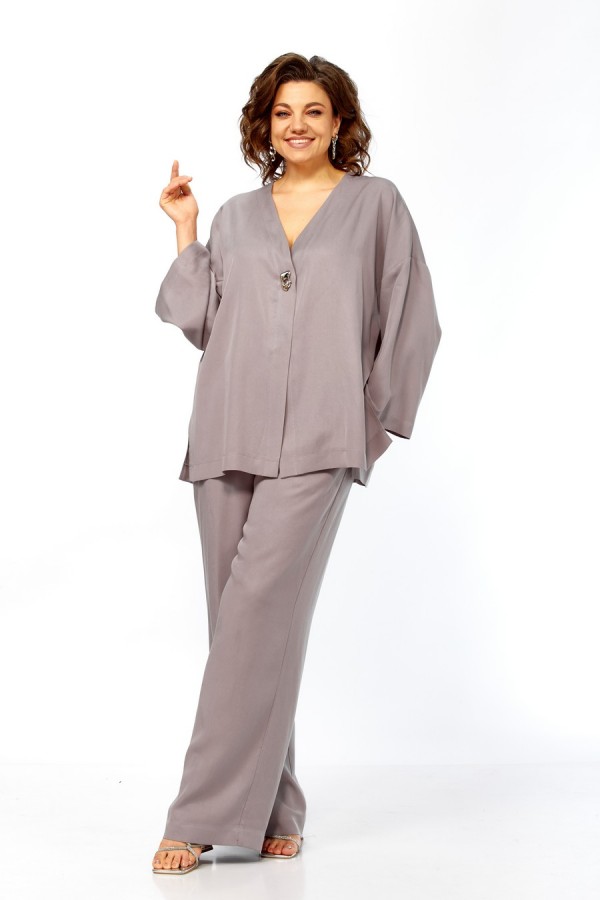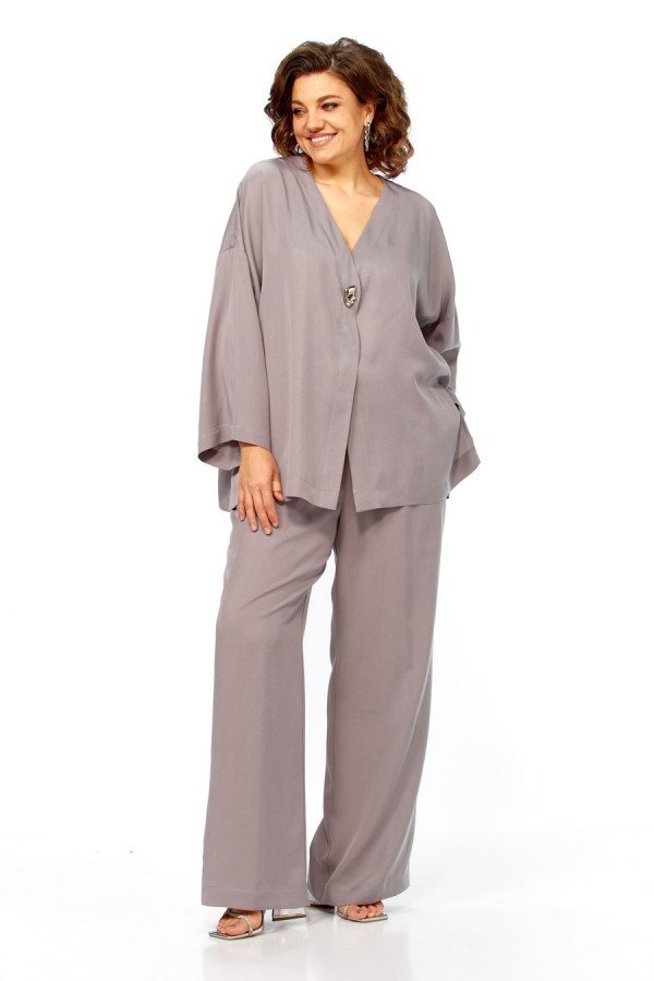 Комплект брючный свободного кроя состоит из кардигана и брюк. Брюки свободного кроя прямые с карманами в боковых швах и поясом на резинке. Кардиган с центральной застежкой на 2 потайные кнопки. Перед с V-образной горловиной, украшен брошью. Рукав втачной одношовный со спущенной линией плеча. По боковым швам разрезы. По бортам широкая отделочная полочка. Фурнитура может отличаться от заявленной на фото.Длина по спинке 69 см, длина рукава 38 см. Длина брюк 104 см.