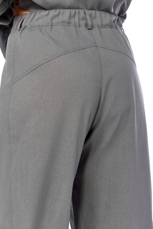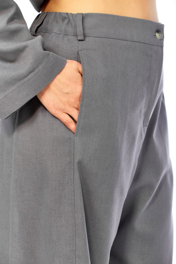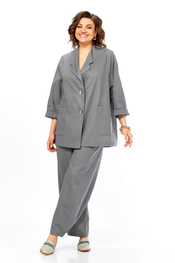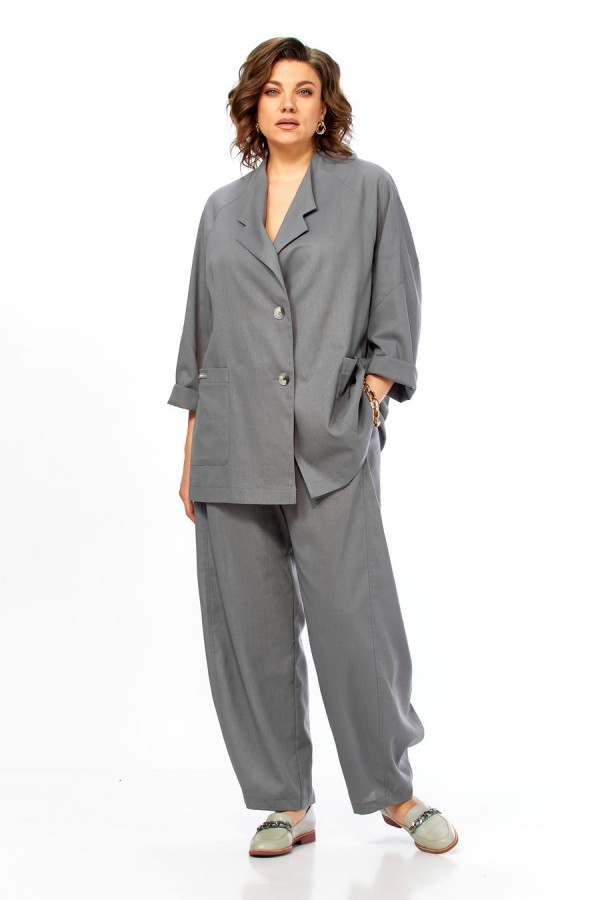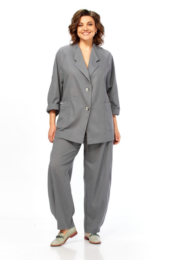 Комплект брючный свободного кроя состоит из жакета и брюк. Жакет прямого силуэта, с застежкой на 2 петли и пуговицы. Спинка с кокеткой, переходящей в рукав-реглан, перед с боковыми накладными карманами. Воротник стойка, переходящая в отворот с лацканами. На правом кармане декор-нашивка. Брюки "О"-образного силуэта с отрезными бочками. Задние половинки с кокеткой. Задние половинки брюк с застежкой "молния" и боковыми карманами в швах. Пояс частично на резинке со шлевками. Фурнитура может отличаться от заявленной на фото. Длина по спинке 74 см, ширина плеча+длина рукава 72 см. Длина брюк 104 см.