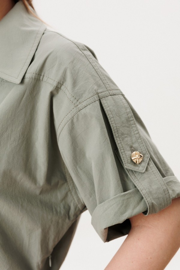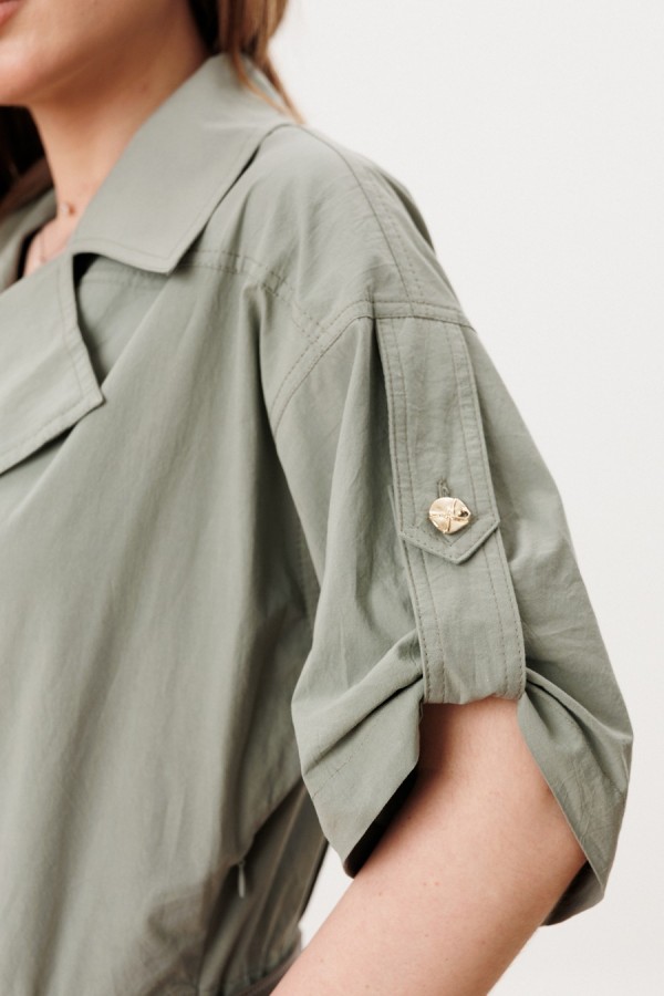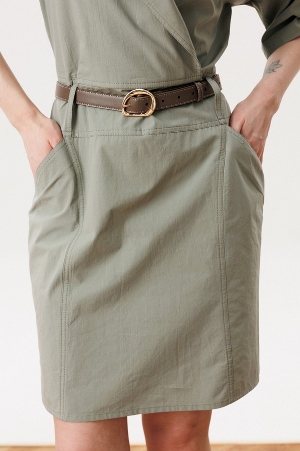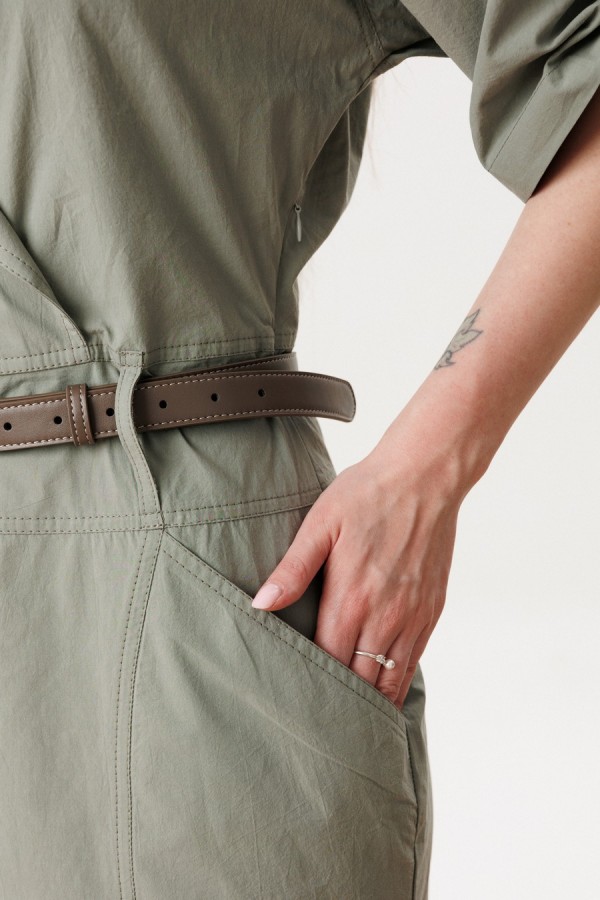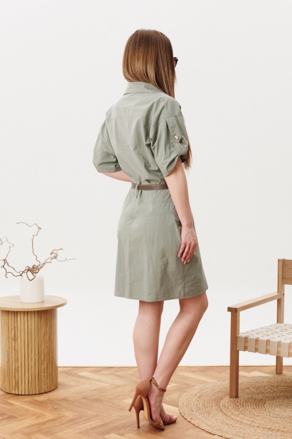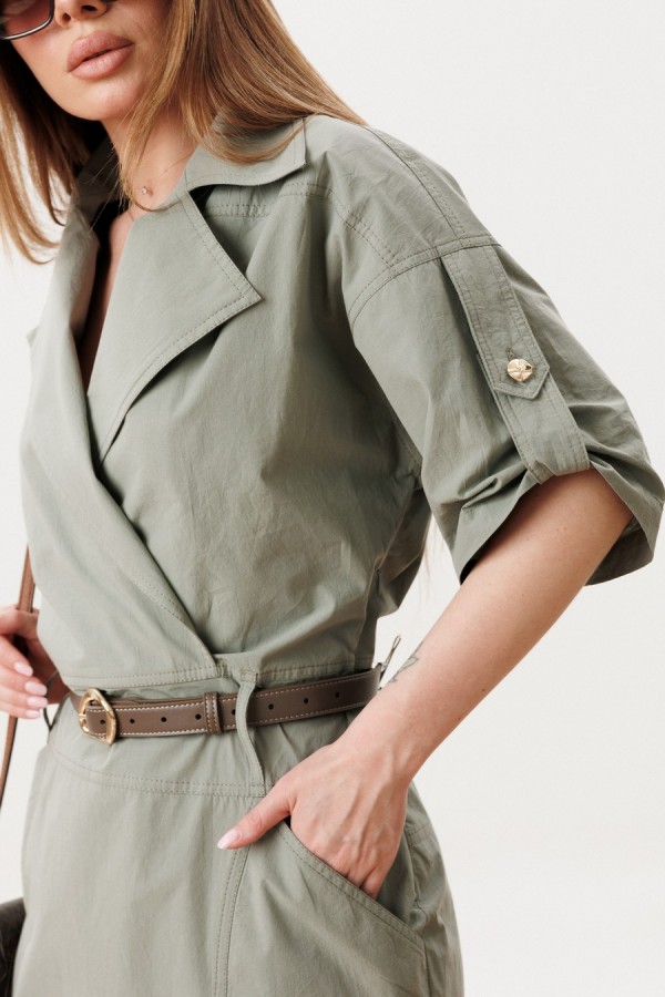 Платье женское полуприлегающего силуэта с застежкой на молнию в левом боковом шве. Перед с плечевыми кокетками, отрезным поясом со шлевками, нижняя часть переда с запахом, воротник отложной с лацканами. Нижняя часть переда с рельефами и карманами от рельефа к боковому шву. Спинка с плечевой кокеткой, отрезным поясом, средним швом и рельефами от кокеток до низа. Рукава украшены хлястиками с петлей и пуговицей. В комплекте съмный пояс. Фурнитура может отличаться от заявленной на фото. Длина по спинке 94 см, длина рукава 23 см.