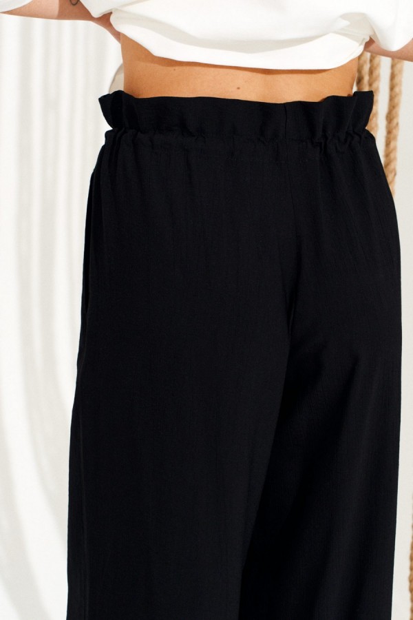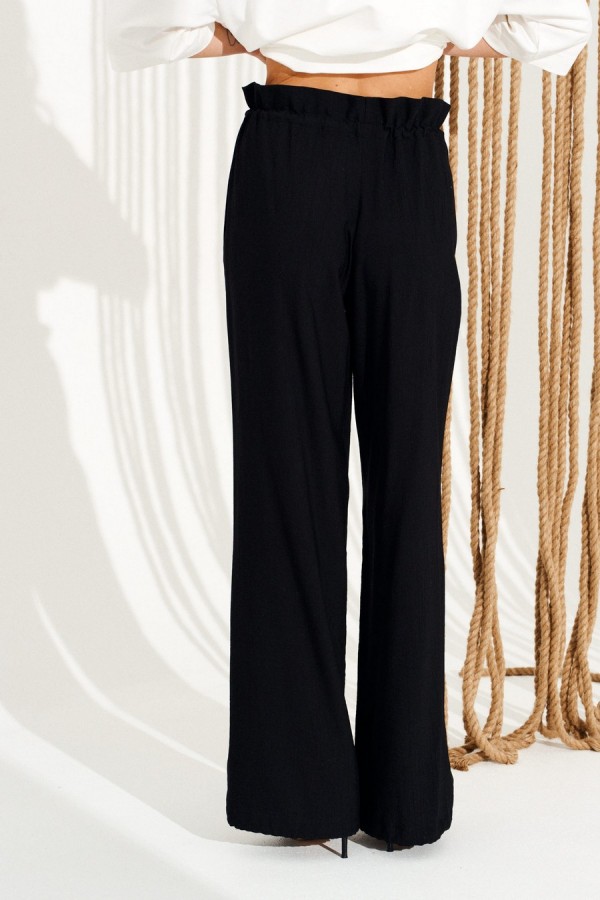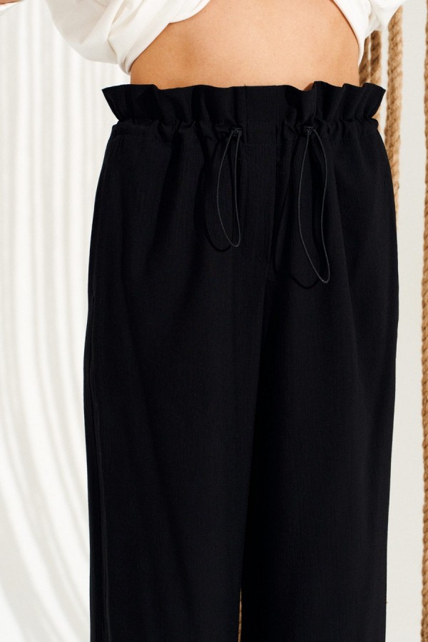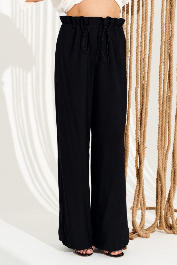 Брюки свободного объема, прямого силуэта. Перед с имитацией гульфика. Пояс цельнокроеный, с отделочными строчками, образующими кулиску, в которую продет эластичный шнур с фиксаторами. Для регулировки объема нижний срез оформлен кулиской с эластичным шнуром и фиксатором. Длина изделия на модели вдоль бокового шва с учетом пояса — 111 см (допустимое отклонение +/- 1 см)