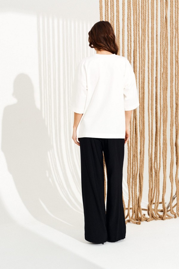 Джемпер из трикотажного полотна свободного объема, прямого силуэта, с круглым вырезом горловины. Вырез горловины обработан притачной обтачкой. Перед и спинка цельные. По переду выполнена печать «Яблоко». Рукав втачной, одношовный, короткий. Длина изделия на модели вдоль середины спинки — 68,5 см (допустимое отклонение +/- 1 см)