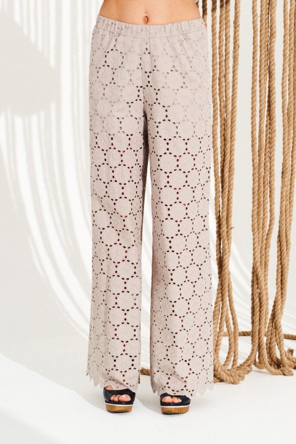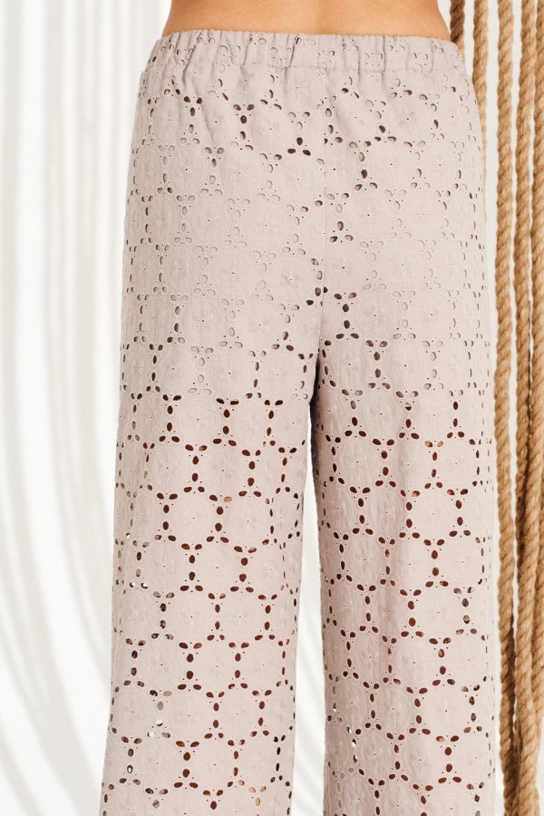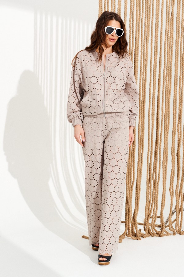 Комплект 2-х предметный, состоящий из блузона и брюк. Блузон свободного объема, прямого силуэта, с центральной застежкой на тесьму-молнию и круглым вырезом горловины, на подкладке. Детали переда с накладными карманами. Спинка цельная. Нижний срез изделия обработан притачным поясом со сборкой на резинку. Рукав втачной, длиной 3/4, одношовный. Нижний срез рукава обработан притачной манжетой со сборкой на резинку. Брюки умеренного объема, прямого силуэта, с отрезным поясом на резинке, частично на подкладке. Длина блузона на модели вдоль середины спинки — 65 см, длина брюк на модели вдоль бокового шва с учетом пояса — 109 см (допустимое отклонение +/- 1 см)