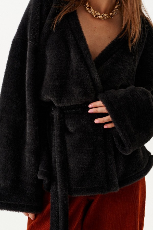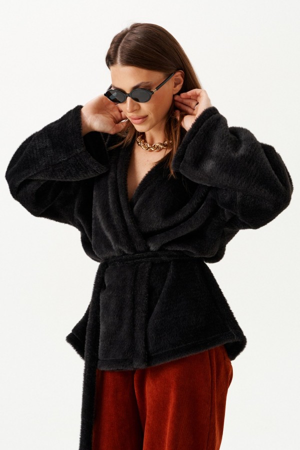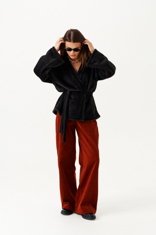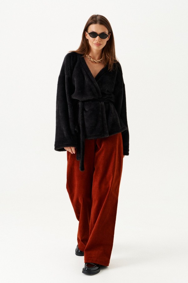 Кардиган из трикотажного полотна умеренного объема, прямого силуэта, на подкладке. Вырез горловины и борта обработаны цельнокроеной планкой. Линия плеча спущенная. Спинка цельная. Рукав втачной, широкий. В комплекте пояс из основной ткани.
