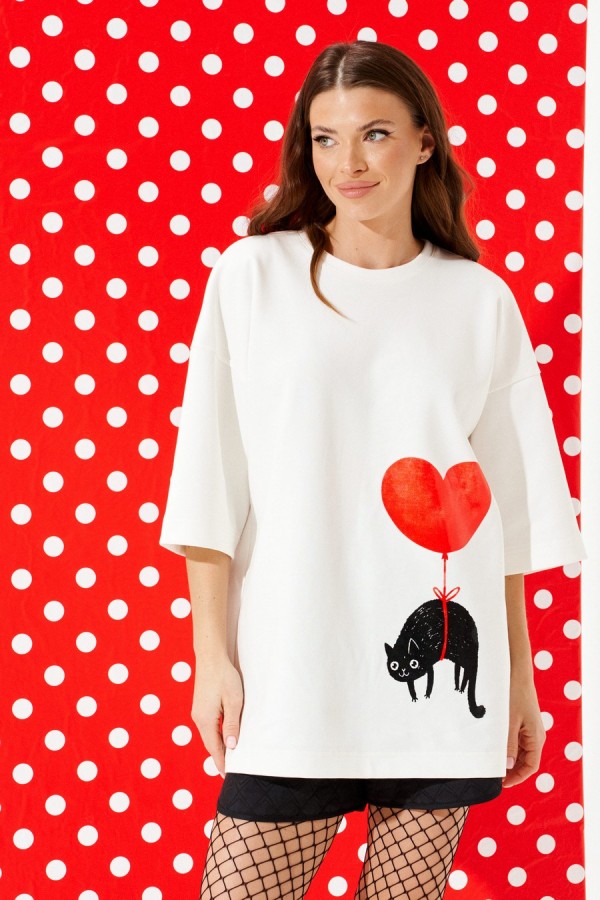 Джемпер из трикотажного полотна свободного объема, прямого силуэта, с круглым вырезом горловины. Перед и спинка цельные. По переду выполнена печать «Кот на воздушном шаре». Рукав втачной, одношовный, короткий.