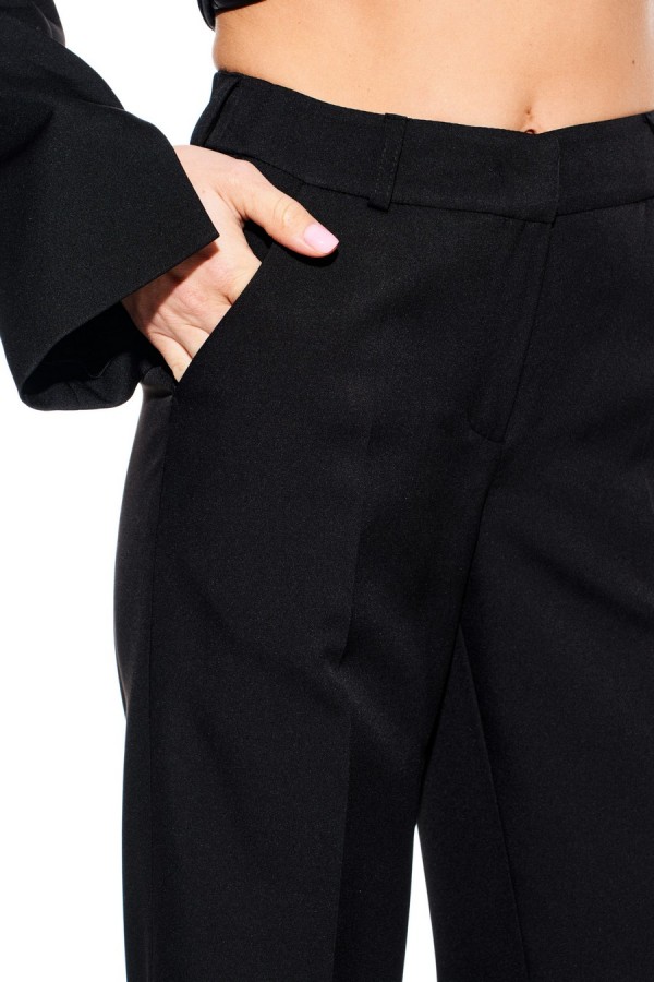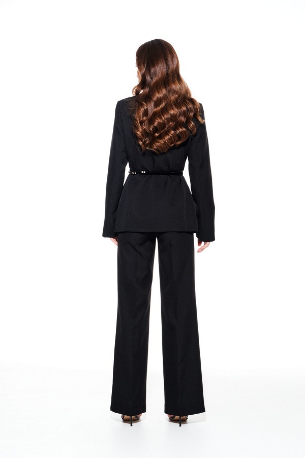 Комплект из костюмно-плательной ткани, 2-х предметный, состоящий из жакета и брюк. Жакет умеренного объема, приталенного силуэта, однобортный, с центральной застежкой на петли и пуговицы, с фигурным вырезом горловины, на подкладке. Детали переда с талиевыми вытачками и прорезными карманами с двумя обтачками. Рукав втачной, двухшовный, длинный, с разрезом. В комплекте декоративный пояс из бархата на трикотажной основе с бусинами. Брюки умеренного объема, прямого силуэта. На передних и задних половинках заутюжены стрелки. На передних половинках выполнены боковые карманы с отрезным бочком. Задние половинки с талиевыми вытачками. Застежка – гульфик на молнии. Пояс притачной, с резинкой по спинке, застежкой на крючок и потайную пуговицу.