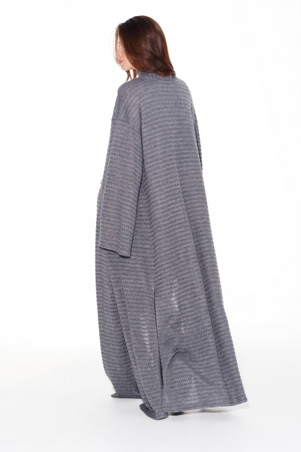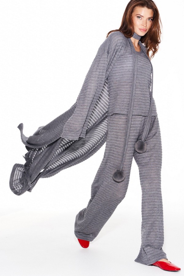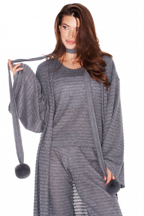 Костюм женский 3-х предметный из трикотажного полотна, состоящий из топа, брюк и кардигана. Топ умеренного объема, полуприлегающего силуэта. Вырез горловины округлой формы. Горловина и проймы обработаны притачными бейками. Брюки прямые, на притачном поясе с резинкой. Кардиган свободного объема, прямого силуэта, со съемным поясом из основной ткани. Пояс декорирован пришивными помпонами. Вырез горловины и борта обработаны цельнокроеной планкой. Боковые швы заканчиваются разрезами. Рукав втачной, широкий, длинный.