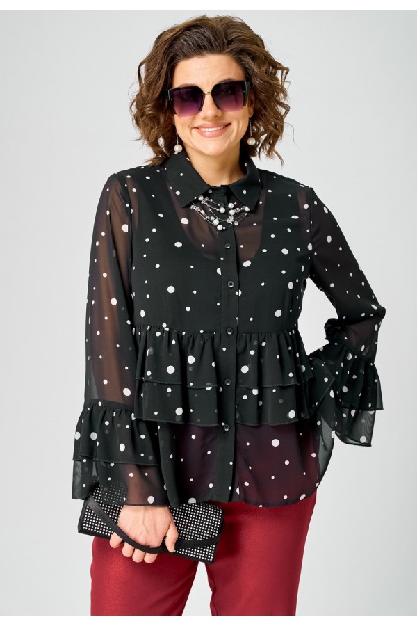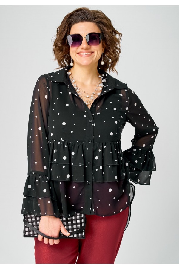 Блуза женская шикарная нарядно - повседневнаая полуприлегающего силуэта на подклдке, выполнена из красивого шифона с принтом. Вырез горловины воротник на стойке рубашечного типа, рукав втачной по низу с притачными воланми. Застежка доверху на обметанные петли и пуговицы, низ блузы фигурный (по спинке длиннее). По переду блузы притачные воланы, в боковых швах обработаны разрезы. Декором блузы служит принт амой ткани и отделочные элементы в виде воланов.