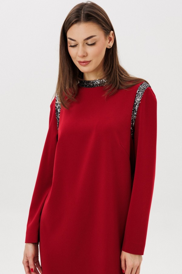 Удобство и стиль-главная идея этого платья. Кажущаяся простота-завораживает, мерцающая пайетка-приковывает взор, от вас невозможно оторвать взгляд. Свободный упрямленный силуэт, покрой-полуреглан, воротник-стойка, застежка по центру спинки на потайную молнию. По линиям пройм на полочке и спинке, стойка из отделочного полотна в пайетку. Полочка с нагрудной вытачкой. Длина платья около 100 см. Длина рукава около 62 см.