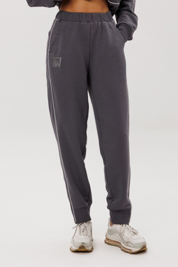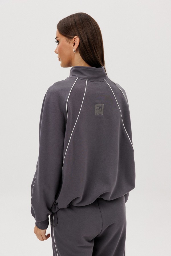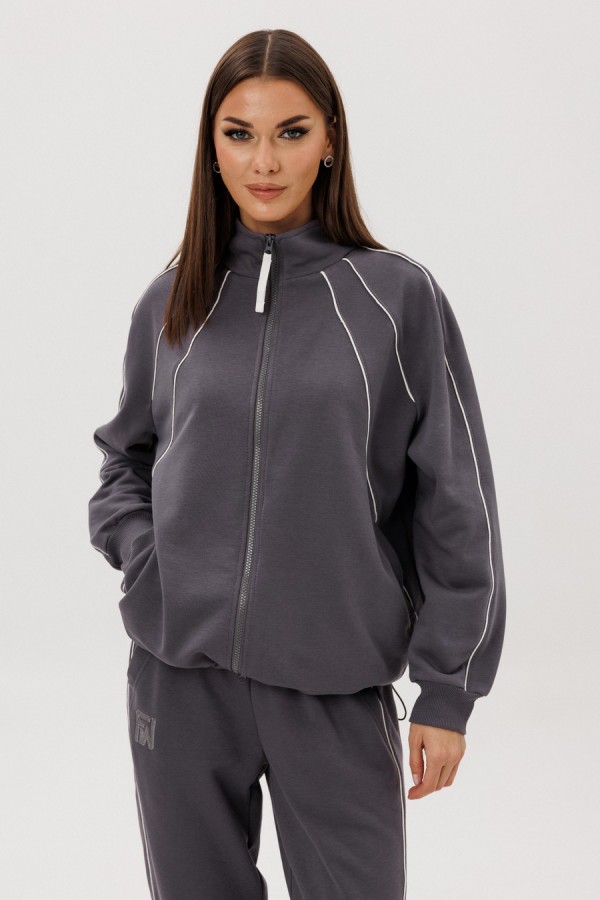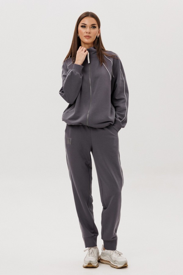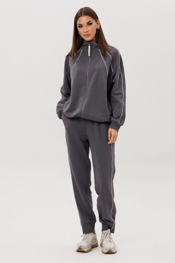 Современный костюм в стиле спорт-кэжуал — идеальный баланс комфорта и актуального дизайна. Модель выполнена из мягкого трикотажного полотна с добавлением хлопка, обеспечивающего приятные тактильные ощущения и свободу движений. Джемпер покроя реглан с аккуратной стойкой и застёжкой-молнией украшен контрастными кантами, придающими образу динамику. Брюки со слегка зауженным силуэтом и манжетами по низу дополнены эластичным поясом для удобной посадки. Костюм легко интегрируется в повседневный гардероб — от прогулок до путешествий и отдыха в городе.