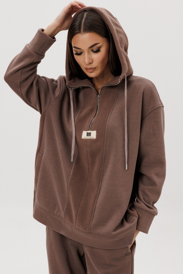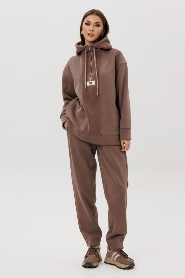 Уютный костюм из тёплого футера с мягким начёсом «барашек» — идеальный выбор для прохладного сезона. Толстовка свободного силуэта с объёмным капюшоном и функциональной молнией спереди создаёт стильный и комфортный образ. Акцентная отделка и фирменная нашивка добавляют современный штрих. Брюки прямого кроя с эластичным поясом и манжетами обеспечивают удобную посадку и свободу движений. Мягкий хлопковый футер с нежным ворсом внутри сохраняет тепло, приятно ощущается на коже и держит форму даже после стирки.