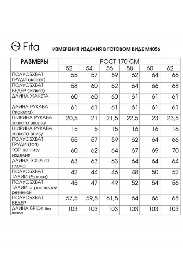 Состав:жакет 60% вискоза, 36% полиамид 4% спандекс; брюки 70% полиэстер, 30% вискоза; майка-топ 70% полиэстер, 30% вискоза.