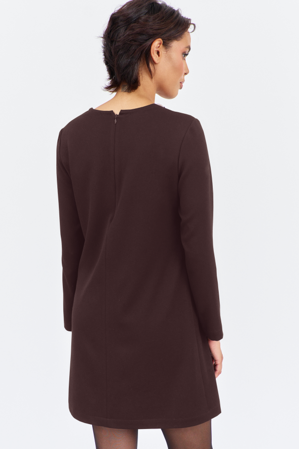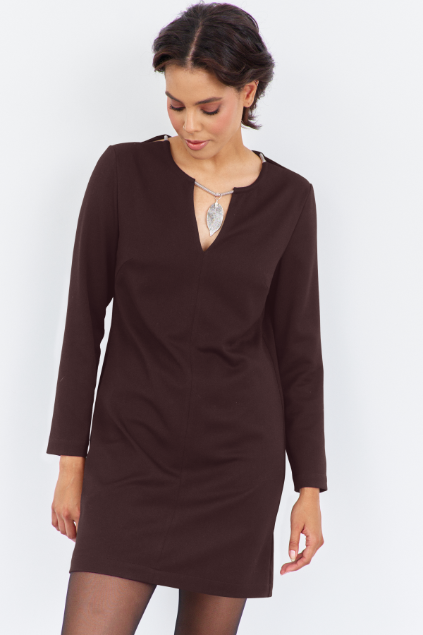 Платье прямого силуэта. Характеристики: выполнено из плательной ткани в шоколад цвете, по горловине переда и спинки декоративный элемент с цепочкой и подвеской, спинка разрезная на потайную застежку-молнию. Длина платья 88 см, длина рукава 60 см.