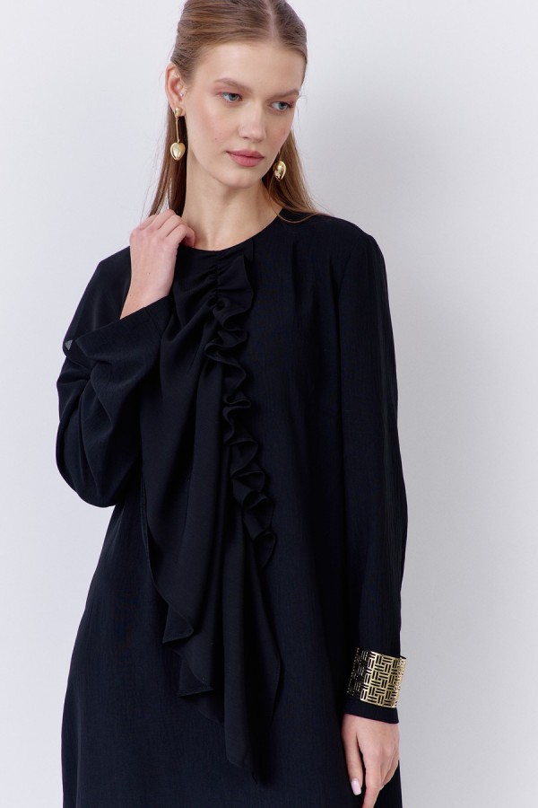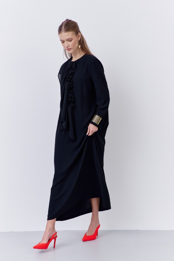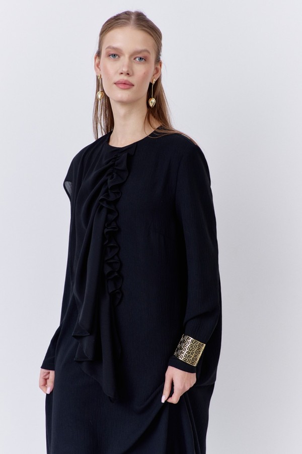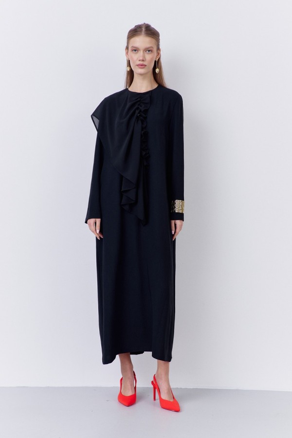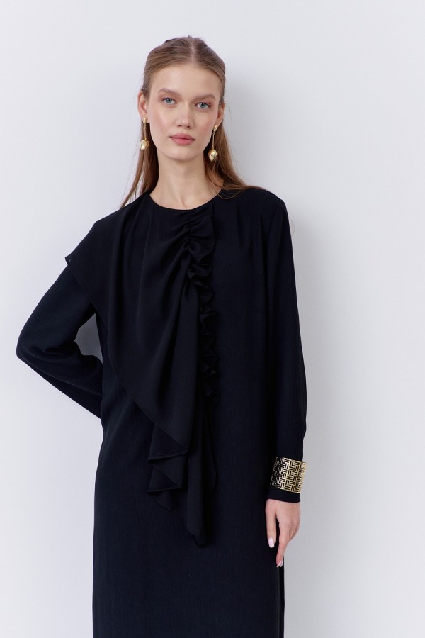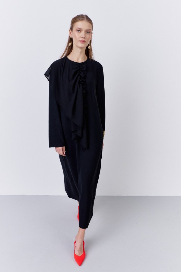 Платье прямого силуэта с декоративным элементом по переду. Характеристики: выполнено из плательной ткани в черном цвете, застежка-молния по спинке, по переду декоративный элеент из шифоновой ткани.