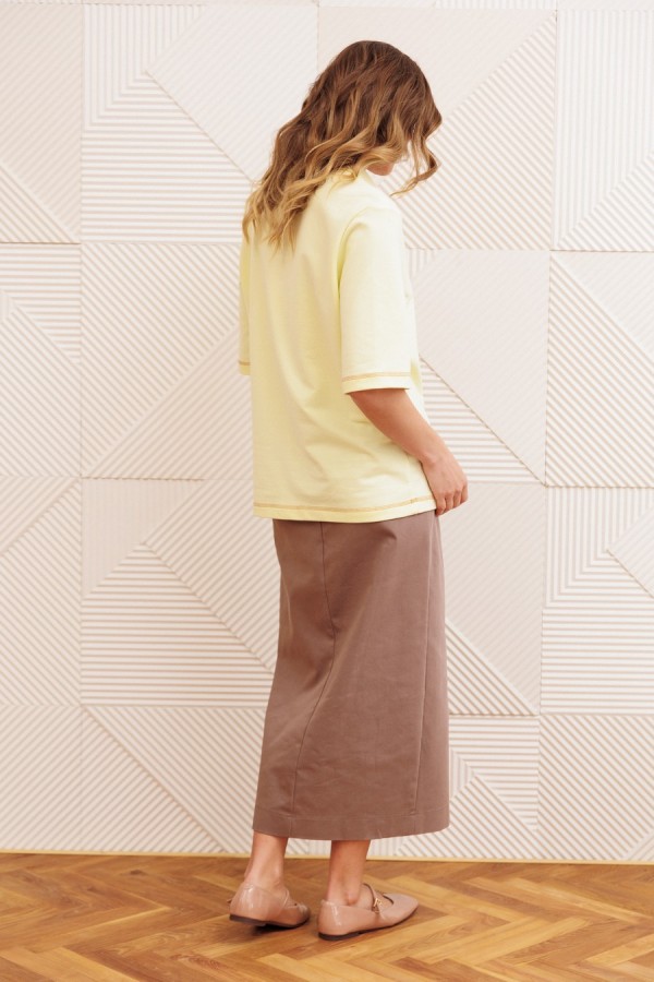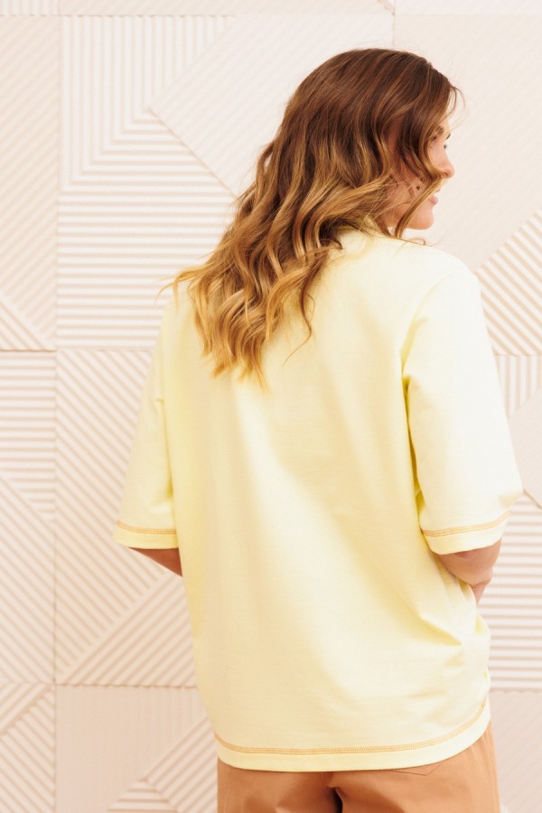 Джемпер прямого силуэта с воротником поло. Рукав втачной одношовный. По низу изделия, по низу рукава и по воротнику проложена отделочная строчка. Длина джемпера- 66 см, длина рукава - 30 см