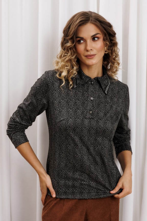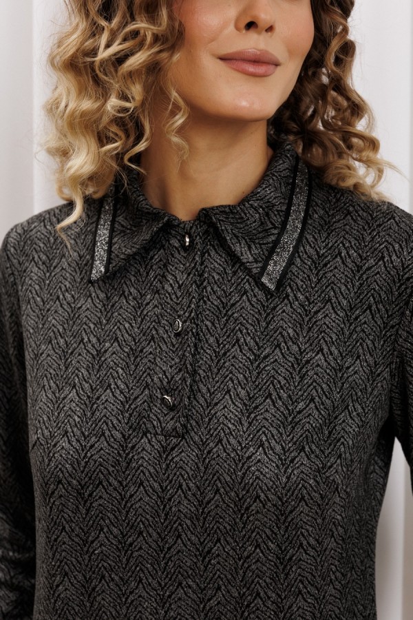 Джемпер прямого силуэта из трикотажного замшевого полотна с тигровым рисунком. Перед с застежкой поло и нагрудными вытачками. По воротнику настрочена декоративная тесьма. Длина джемпера - 60 см, длина рукава - 61 см.