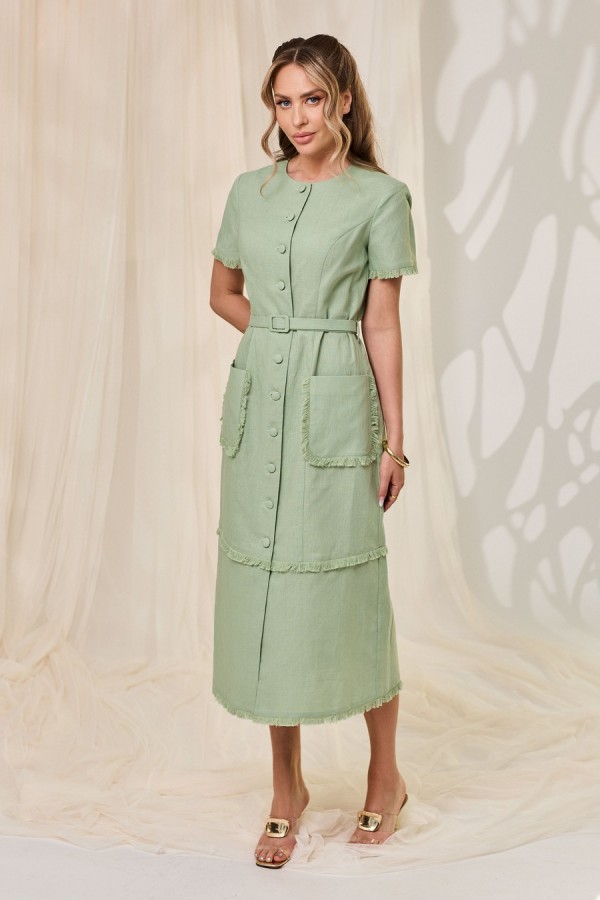 Платье без воротника, с круглым вырезом горловины, центральной застежкой на петли и пуговицы. По переду с рельефами, выходящими из проймы, накладными карманами, расположенными на уровне линии бедер. Спинка со средним швом, рельефами, выходящими из проймы. Низ с отрезной деталью. Рукав втачной, короткий. По низу платья, низу рукавов, карманам и по шву притачивания нижней детали- бахрома из основной ткани. Платье со съемным поясом. Силуэт: полуприлегающий Вид покроя рукава: втачной Цветовая гамма для верха, подкладки, фурнитуры, отделки: платье из ткани в одной цветовой гамме. Тип ткани: текстильный, плательный, Лен 100% Комплектация: платье без подкладки