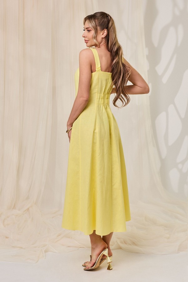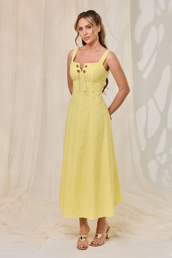 Платье с центральной застежкой на потайную молнию в среднем шве спинки, без воротника, с фигурным вырезом горловины. По переду- со средним швом и рельефами, выходящими из горловины до низа. По горловине переда разрез, декоративные люверсы с цепочкой. Спинка со средним швом, рельефами, выходящими из горловины до низа. На уровне линии талии с-центральные части спинки присборены с помощью резинки. Платье без рукавов, на бретелях. Со стороны спинки бретели присборены частично. Силуэт: полуприлегающий Вид покроя рукава: - Цветовая гамма для верха, подкладки, фурнитуры, отделки: платье из ткани в одной цветовой гамме. Тип ткани: текстильный, плательный, лен 100%, Комплектация: платье без подкладки