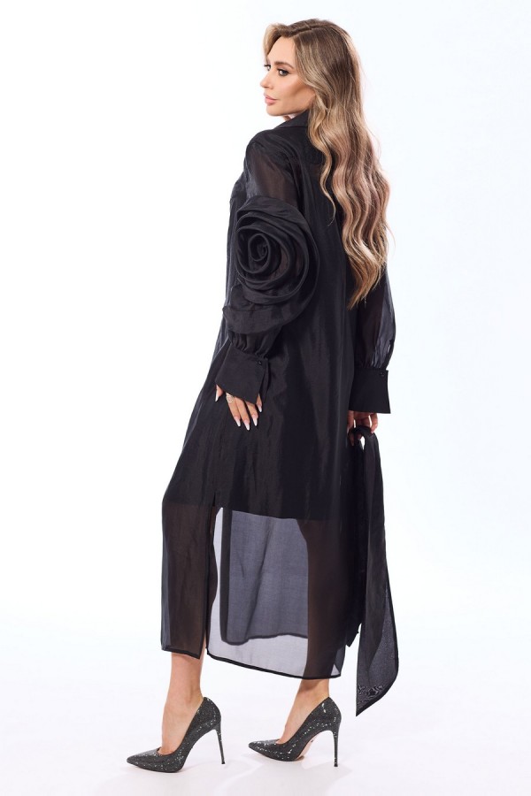 Платье с центральной застежкой на петли и пуговицы, втачным воротником с отрезной стойкой. По переду с клапанами, расположенными на уровне груди. Спинка с отрезной кокеткой. По шву притачивания кокетки- встречная складка. По боковым швам- разрезы. Рукав втачной, длинный, с отрезной манжетой. По левому рукаву отделка- декор в виде розы. Платье двойное. Нижнее платье на бретелях, с нагрудными вытачками по переду. Силуэт: прямой Вид покроя рукава: втачной, длинный, с отрезной манжетой. Цветовая гамма для верха, подкладки, фурнитуры, отделки: платье из ткани в одной цветовой гамме. Нижнее платье в одной цветовой гамме. Тип ткани: текстильный, плательный, Вискоза 77%,Полиэстер 23% Комплектация: платье двойное