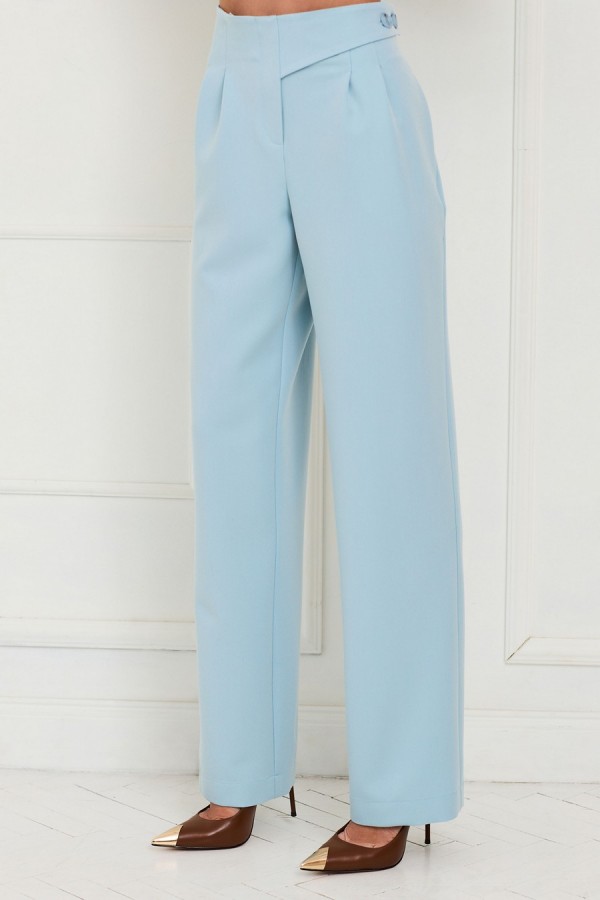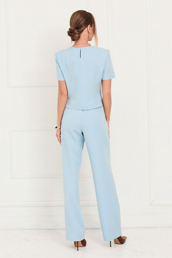 Блузон без воротника, с круглым вырезом горловины, застежкой на навесную петлю и пуговицу по горловине спинки. Перед со средним швом, фигурными рельефными швами. Спинка со средним швом, разрезом по горловине, талиевыми вытачками. Рукав короткий, втачной. Брюки- прямого силуэта, без пояса, верхний срез брюк обработан обтачками, застежкой- гульфик. Пояс в области спинки присборен на резинку. По переду- декоративный пояс, закрепленный к брюкам петлями и пуговицами. В боковых швах расположены карманы. . Силуэт: прямой Вид покроя рукава: втачной Цветовая гамма для верха, подкладки, фурнитуры, отделки: комплект выполнен из ткани в одной цветовой гамме. Тип ткани: текстильный, костюмно – плательный полиэстер 76%, вискоза 22%, спандекс 4% Комплектация: комплект без подкладки