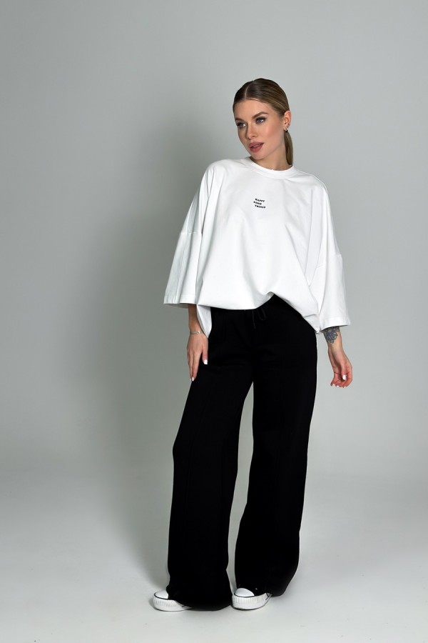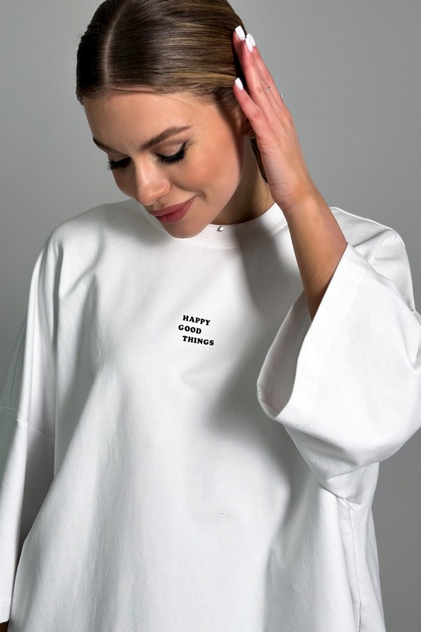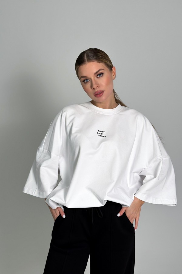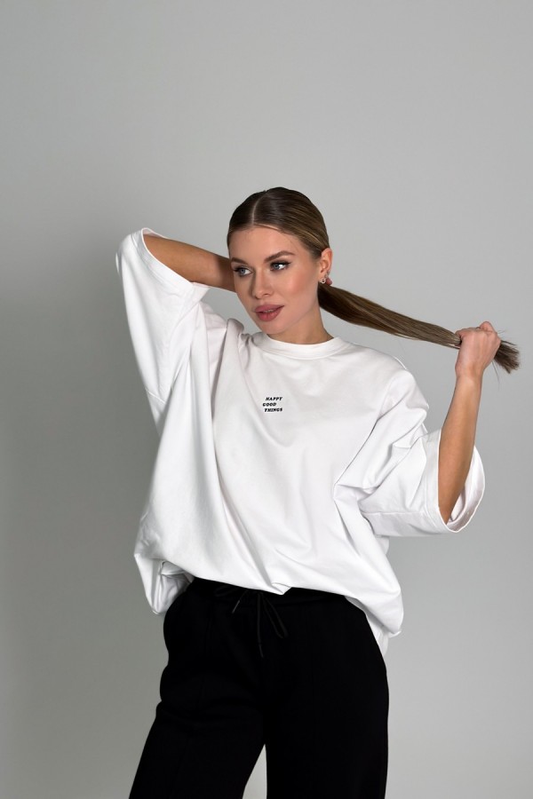 Современная футболка силуэта oversize с мягкой архитектурой формы и выразительным акцентом. Выполнена из плотного трикотажа (95% хлопок, 5% эластан), который обеспечивает комфорт, эластичность и аккуратную посадку. Спущенная линия плеча (≈19 см) и удлинённый рукав формируют актуальный расслабленный силуэт. Круглый вырез горловины аккуратно обработан, низ изделия и рукавов — эластичным швом для чистого и премиального вида. Длина — чуть ниже линии бёдер.