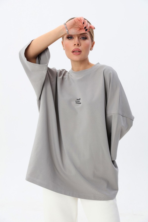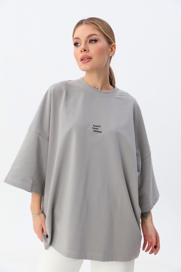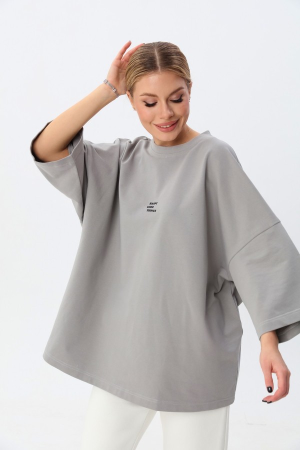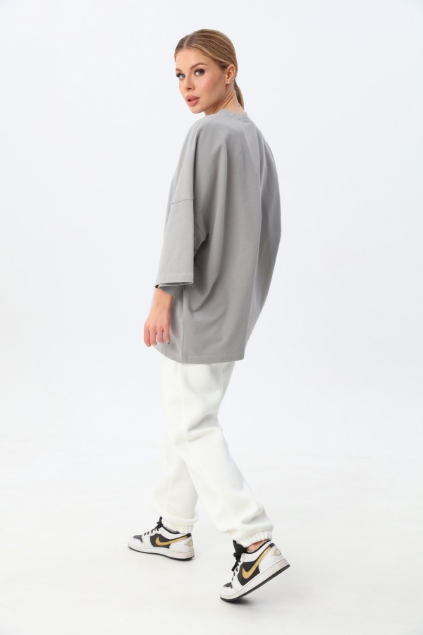 Современная футболка силуэта oversize с мягкой архитектурой формы и выразительным акцентом. Выполнена из плотного трикотажа (95% хлопок, 5% эластан), который обеспечивает комфорт, эластичность и аккуратную посадку. Спущенная линия плеча (≈19 см) и удлинённый рукав формируют актуальный расслабленный силуэт. Круглый вырез горловины аккуратно обработан, низ изделия и рукавов — эластичным швом для чистого и премиального вида. Длина — чуть ниже линии бёдер.