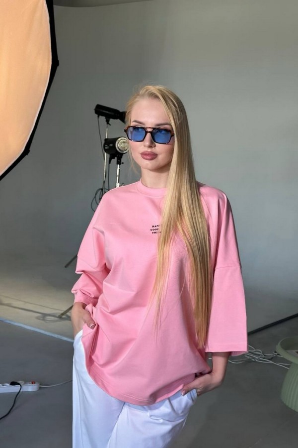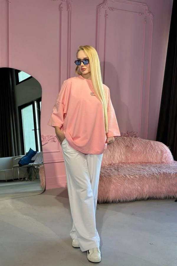 Современная футболка силуэта oversize с мягкой архитектурой формы и выразительным акцентом. Выполнена из плотного трикотажа (95% хлопок, 5% эластан), который обеспечивает комфорт, эластичность и аккуратную посадку. Спущенная линия плеча (≈19 см) и удлинённый рукав формируют актуальный расслабленный силуэт. Круглый вырез горловины аккуратно обработан, низ изделия и рукавов — эластичным швом для чистого и премиального вида. Длина — чуть ниже линии бёдер.