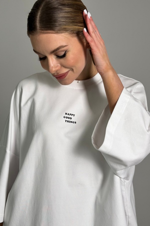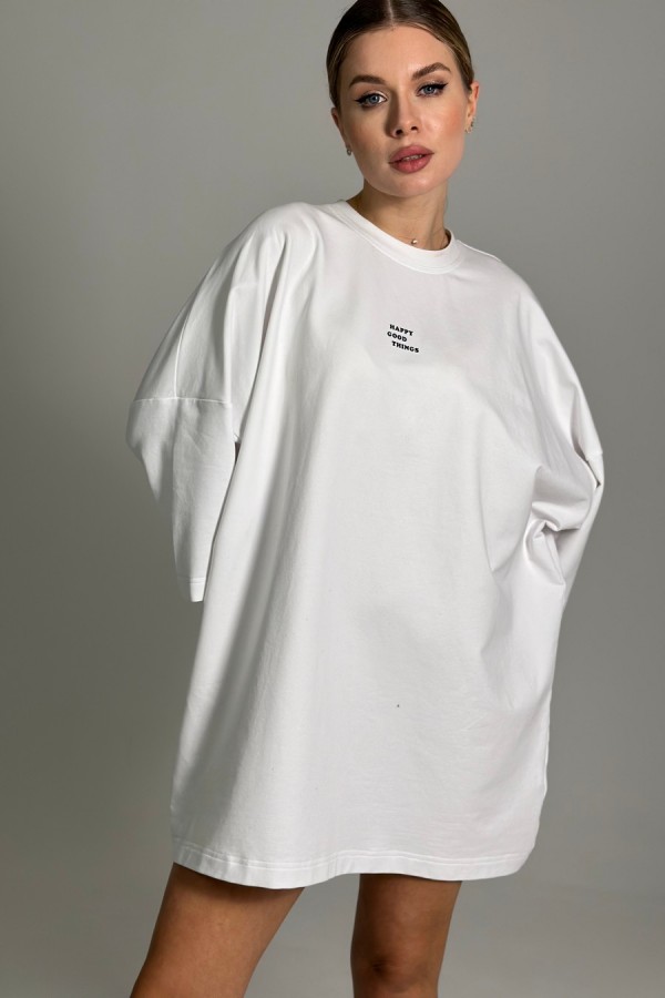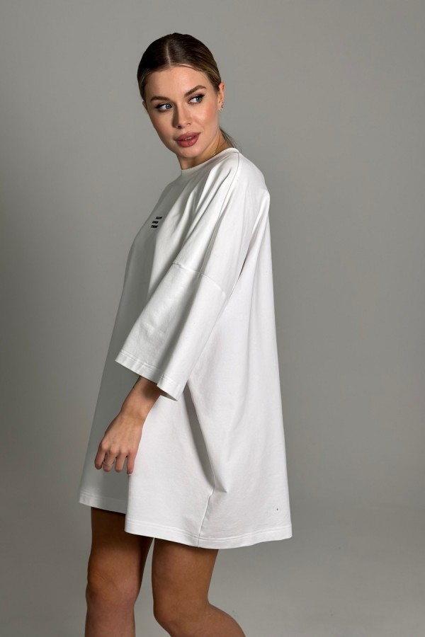 Платье силуэта oversize — современная модель с архитектурной формой и расслабленной посадкой. Выполнено из мягкого трикотажа 2х нитка (95% хлопок, 5% эластан), который обеспечивает комфорт, эластичность и аккуратную форму в носке. Спущенная линия плеча и углублённая пройма формируют актуальный объём, рукав рубашечного покроя — одношовный. Круглый вырез горловины обработан обтачкой, низ изделия и рукавов — эластичным швом для чистого и аккуратного вида. Акцент модели — декоративная наклейка по центру груди. Длина платья 86 см