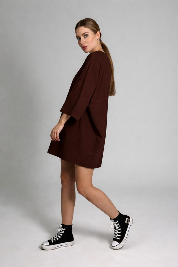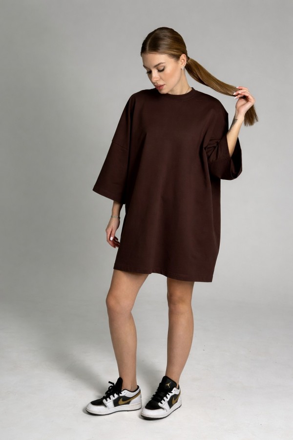 Платье силуэта oversize — современная модель с архитектурной формой и расслабленной посадкой. Выполнено из мягкого трикотажа 2х нитка (95% хлопок, 5% эластан), который обеспечивает комфорт, эластичность и аккуратную форму в носке. Спущенная линия плеча и углублённая пройма формируют актуальный объём, рукав рубашечного покроя — одношовный. Круглый вырез горловины обработан обтачкой, низ изделия и рукавов — эластичным швом для чистого и аккуратного вида. Акцент модели — декоративная наклейка по центру груди. Длина платья 86 см